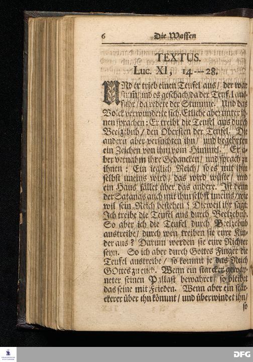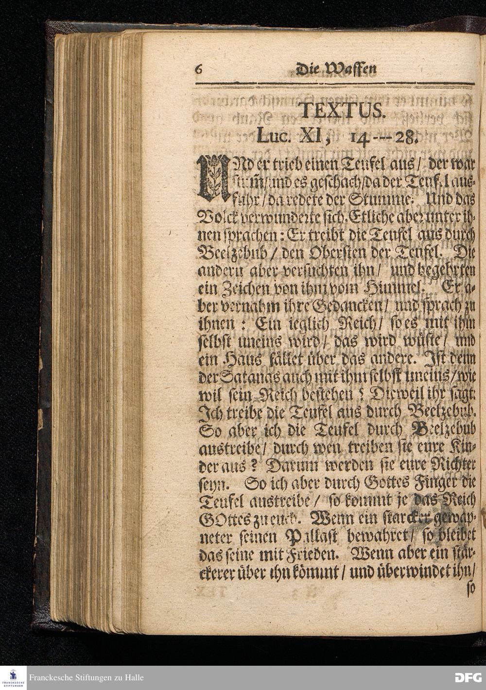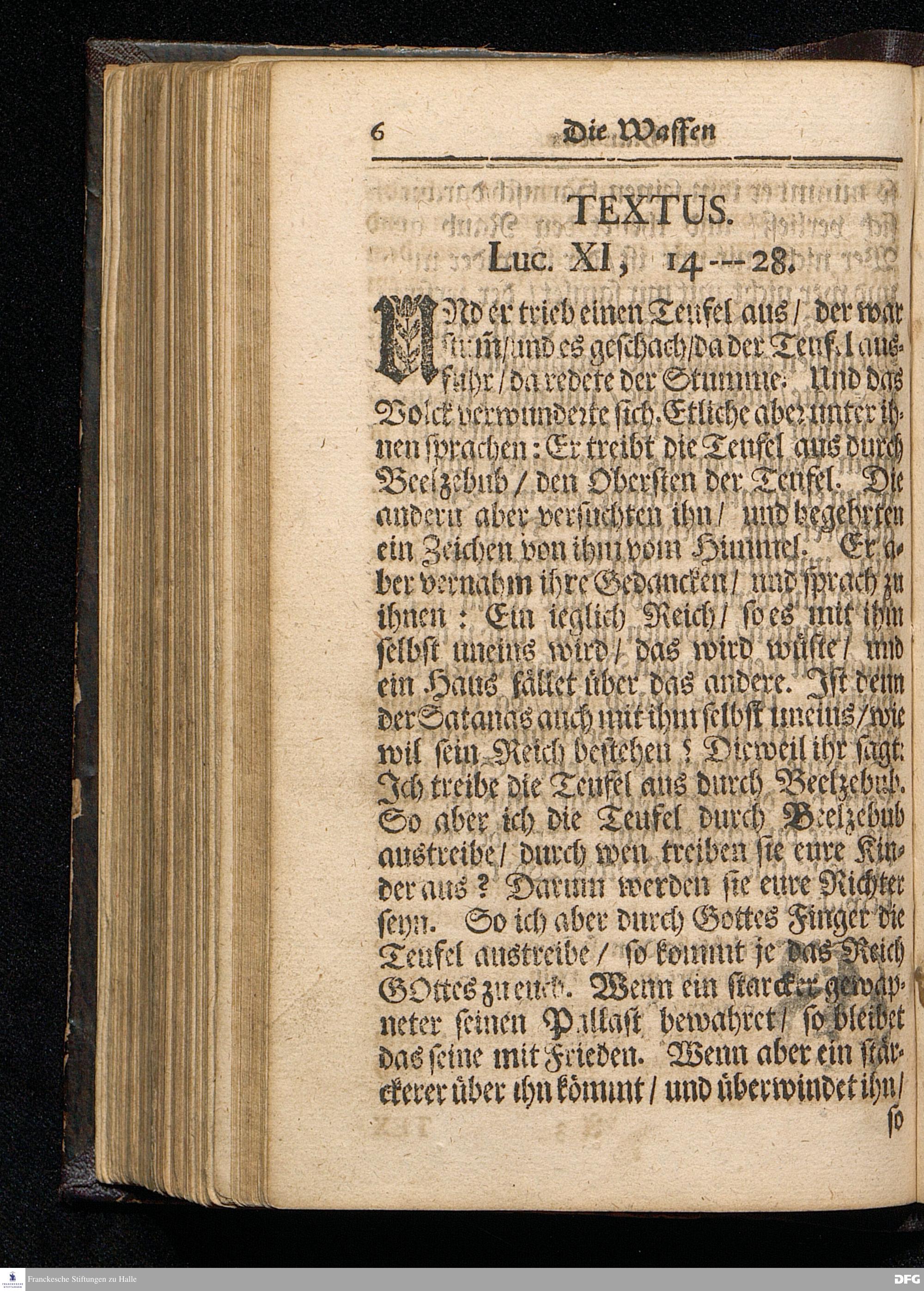Die Waffen des Glaubens / Auf Oculi MDCCXVI. Aus Luc.XI, 14--28. In der St.Ulrichs=Kirchen in Halle vorgestellet von August Hermann Francken / S.Theol.Prof.& Past.zu S.Ulrich / und des Gymnasii Scholarcha. HALLE / Gedruckt und zu finden im Wäysen=Hause / 1716.