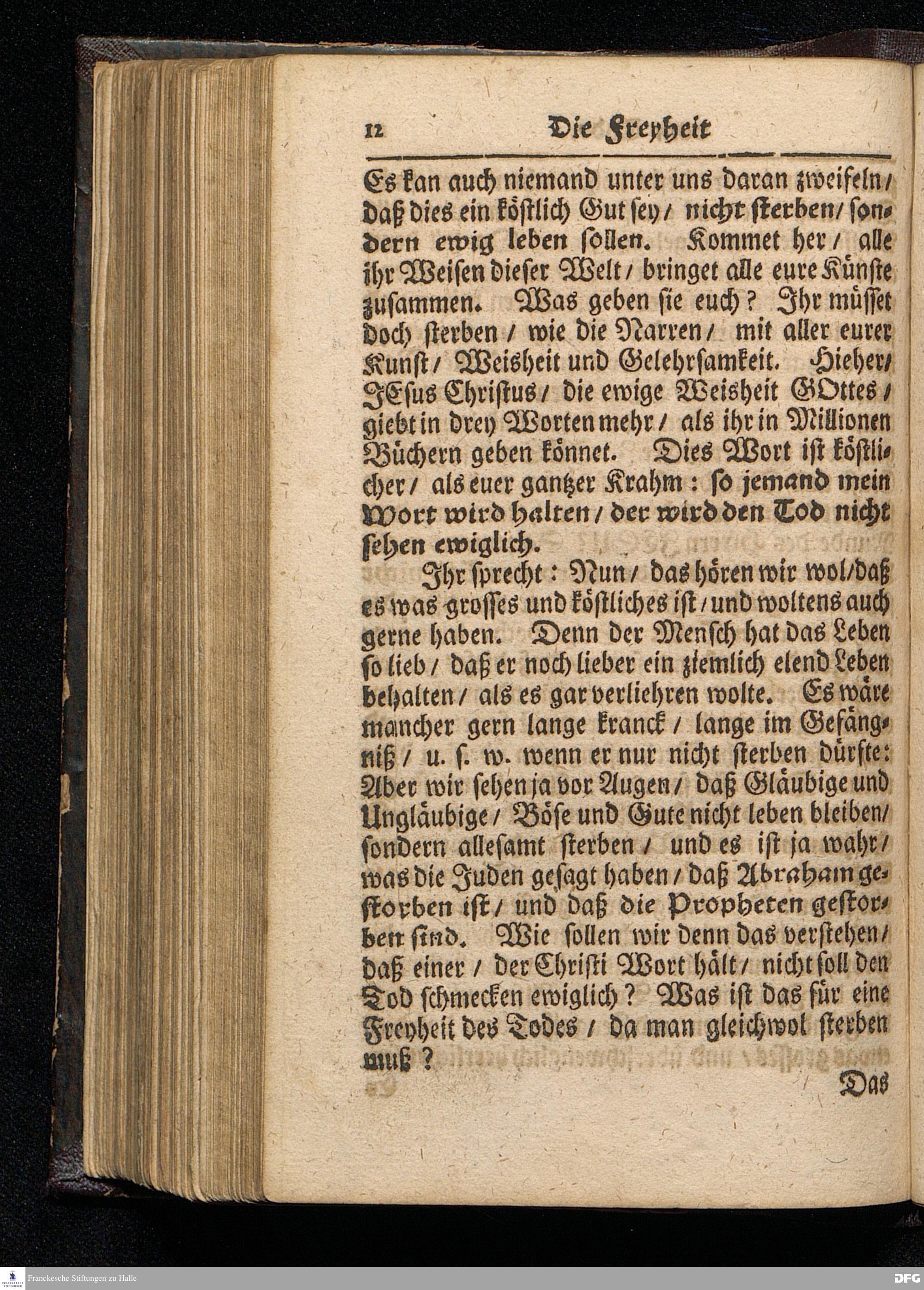 Die Freyheit vom Tode / Auf Judica MDCCXVI. Aus Joh.VIII, 46--59. In der St.Ulrichs=Kirchen in Halle / vorgestellet von August Hermann Francken / S.Theol.Prof.& Past.zu S.Ulrich / und des Gymnasii Scholarcha. HALLE / Gedruckt und zu finden im Wäysen=Hause 1716.