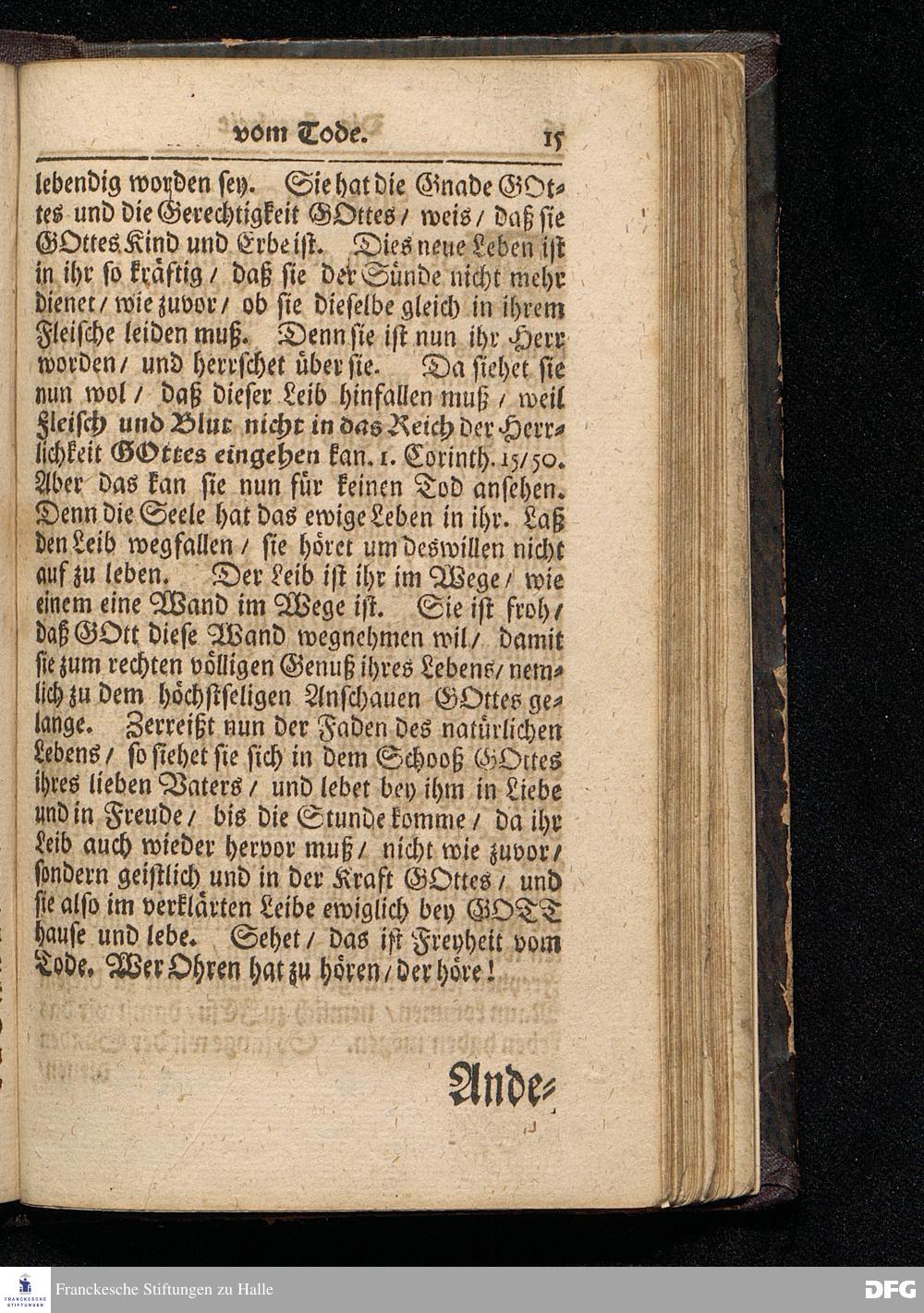 Die Freyheit vom Tode / Auf Judica MDCCXVI. Aus Joh.VIII, 46--59. In der St.Ulrichs=Kirchen in Halle / vorgestellet von August Hermann Francken / S.Theol.Prof.& Past.zu S.Ulrich / und des Gymnasii Scholarcha. HALLE / Gedruckt und zu finden im Wäysen=Hause 1716.