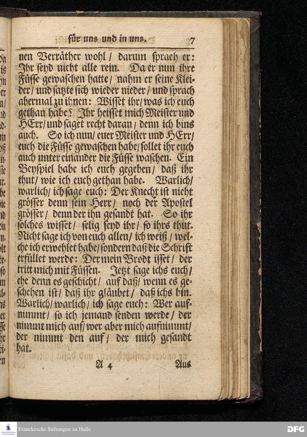 Das Gedächtniß CHristi für uns und in uns / Am Grünen Donnerstage 1716. Aus der Evangelischen Historie Von der Einsetzung des Heil.Abendmahls / und vom Fuß=Waschen CHristi / In der St.Ulrichs=Kirchen in Halle angewiesen von August Hermann Francken / S.Theol.Prof.& Past.zu S.Ulrich / und des Gymnasii Scholarcha. HALLE / Gedruckt und zu finden im Wäysen=Hause. 1716.