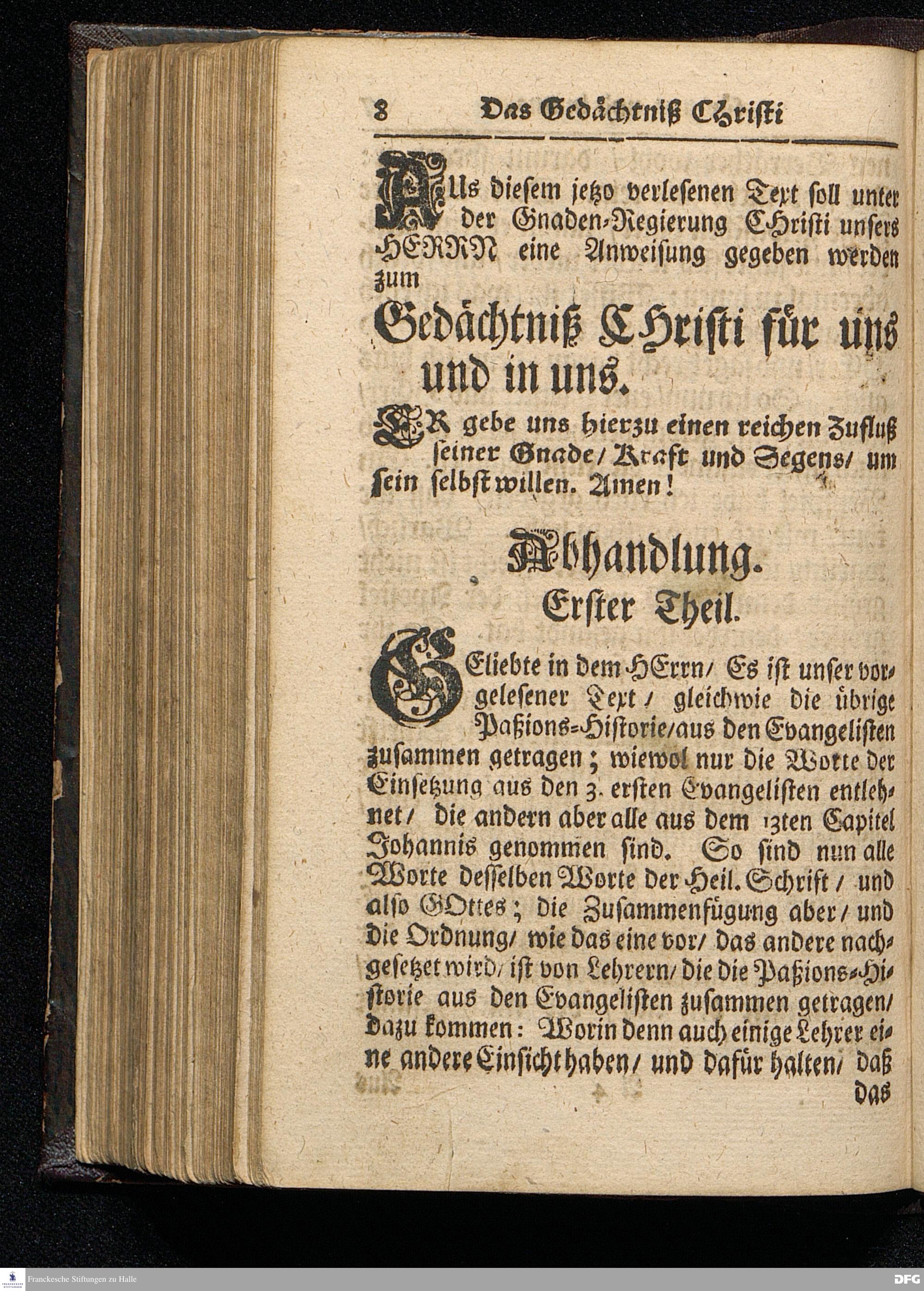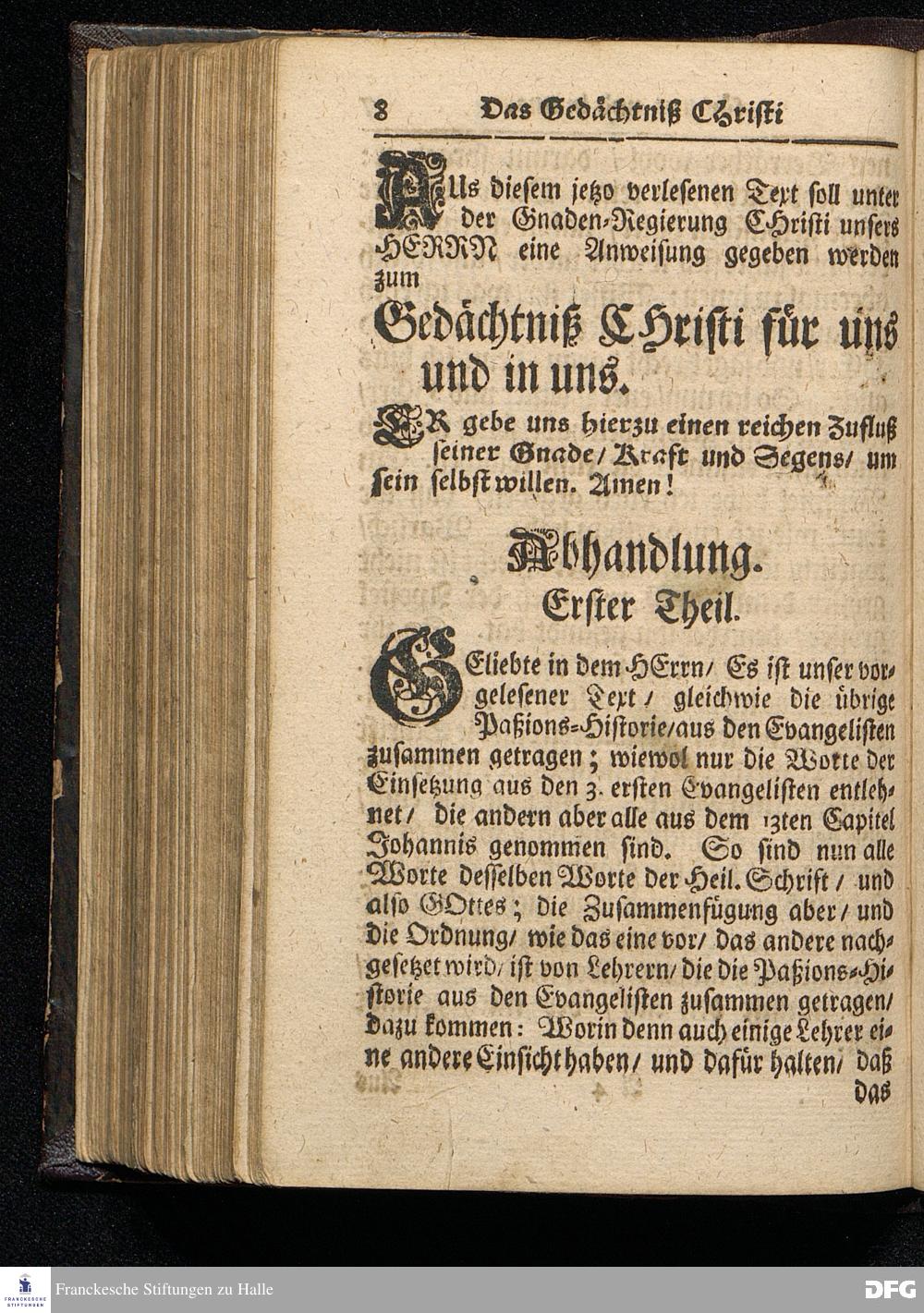 Das Gedächtniß CHristi für uns und in uns / Am Grünen Donnerstage 1716. Aus der Evangelischen Historie Von der Einsetzung des Heil.Abendmahls / und vom Fuß=Waschen CHristi / In der St.Ulrichs=Kirchen in Halle angewiesen von August Hermann Francken / S.Theol.Prof.& Past.zu S.Ulrich / und des Gymnasii Scholarcha. HALLE / Gedruckt und zu finden im Wäysen=Hause. 1716.