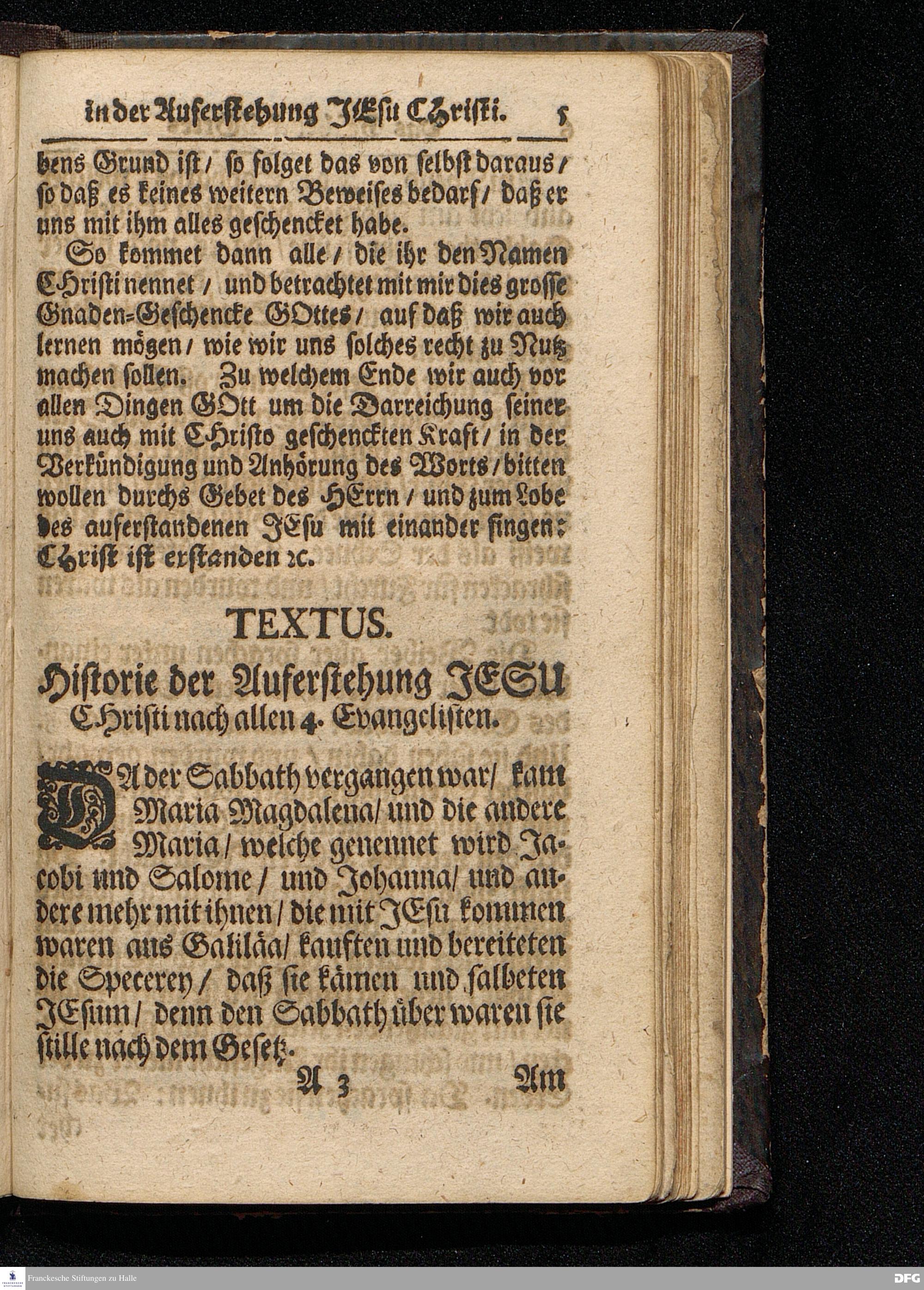 Das Geschenck GOttes In der Auferstehung JESU CHristi / Aus dem Anfang der Historie der Auferstehung JEsu CHristi Nach allen 4.Evangelisten Am Isten Oster=Feyertage In der St.Ulrichs=Kirchen in Halle angewiesen von August Hermann Francken / S.Theol.Prof.& Past.zu S.Ulrich / und des Gymnasii Scholarcha. HALLE / Gedruckt und zu finden im Wäysen=Hause 1716.