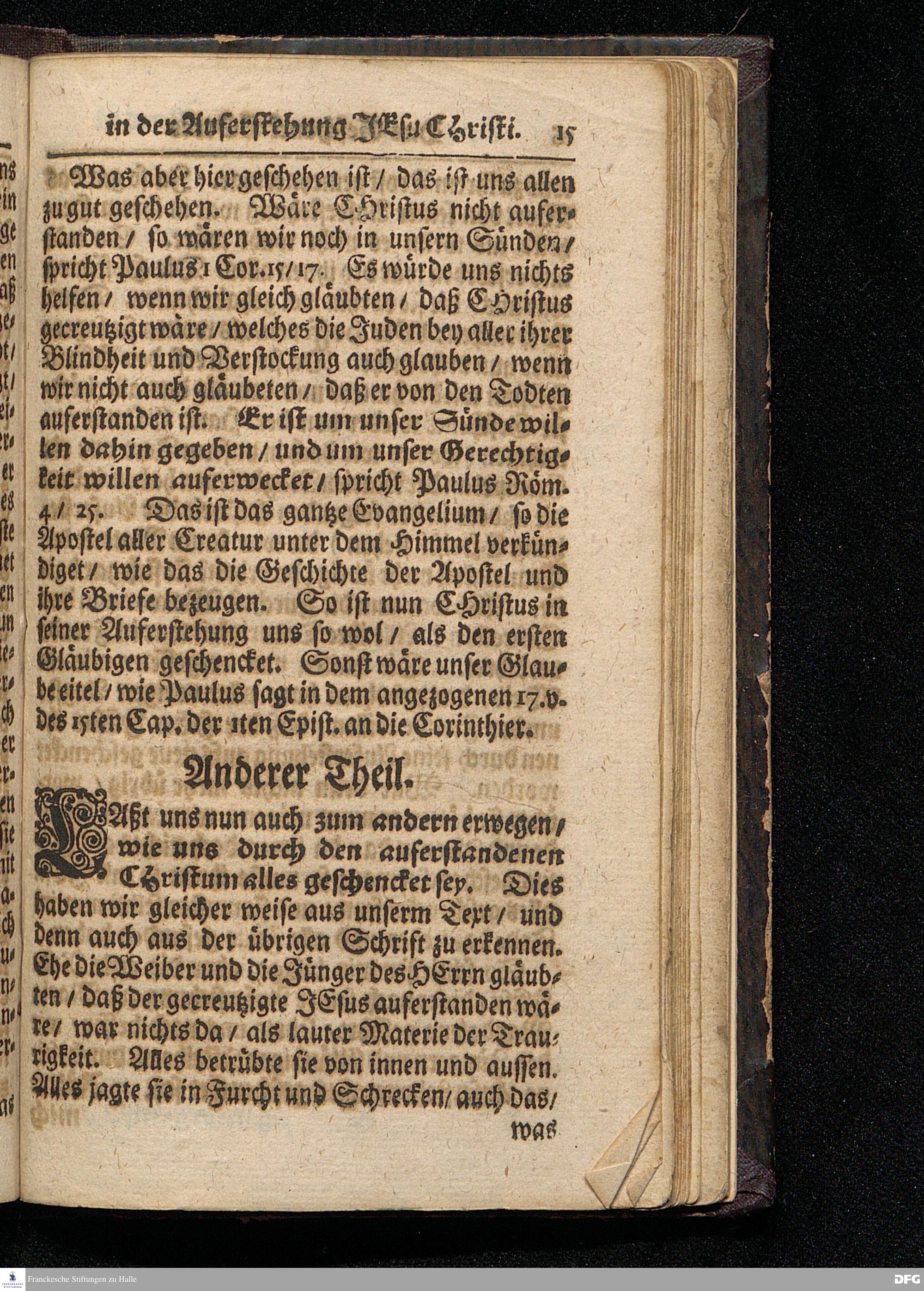 Das Geschenck GOttes In der Auferstehung JESU CHristi / Aus dem Anfang der Historie der Auferstehung JEsu CHristi Nach allen 4.Evangelisten Am Isten Oster=Feyertage In der St.Ulrichs=Kirchen in Halle angewiesen von August Hermann Francken / S.Theol.Prof.& Past.zu S.Ulrich / und des Gymnasii Scholarcha. HALLE / Gedruckt und zu finden im Wäysen=Hause 1716.