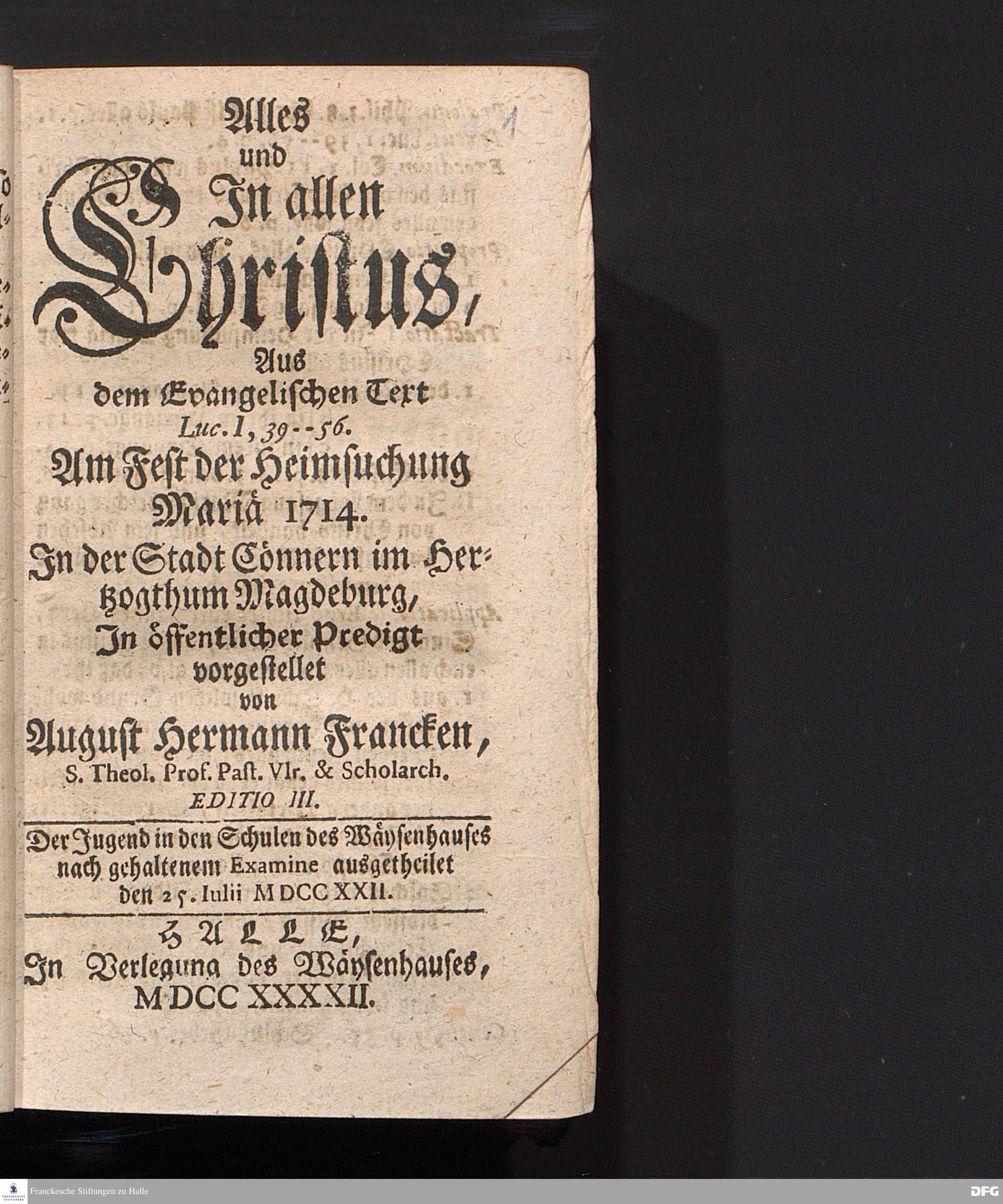 Alles und In allen Christus, Aus dem Evangelischen Text Luc.I, 39--56. Am Fest der Heimsuchung Mariä 1714. In der Stadt Cönnern im Hertzogthum Magdeburg, In öffentlicher Predigt vorgestellet von August Hermann Francken, S.Theol.Prof.Past.Vlr.& Scholarch. EDITIO III. Der Jugend in den Schulen des Wäysenhauses nach gehaltenem Examine ausgetheilet den 25.Iulii MDCCXXII. HALLE, In Verlegung des Wäysenhauses, MDCCXXXXII.