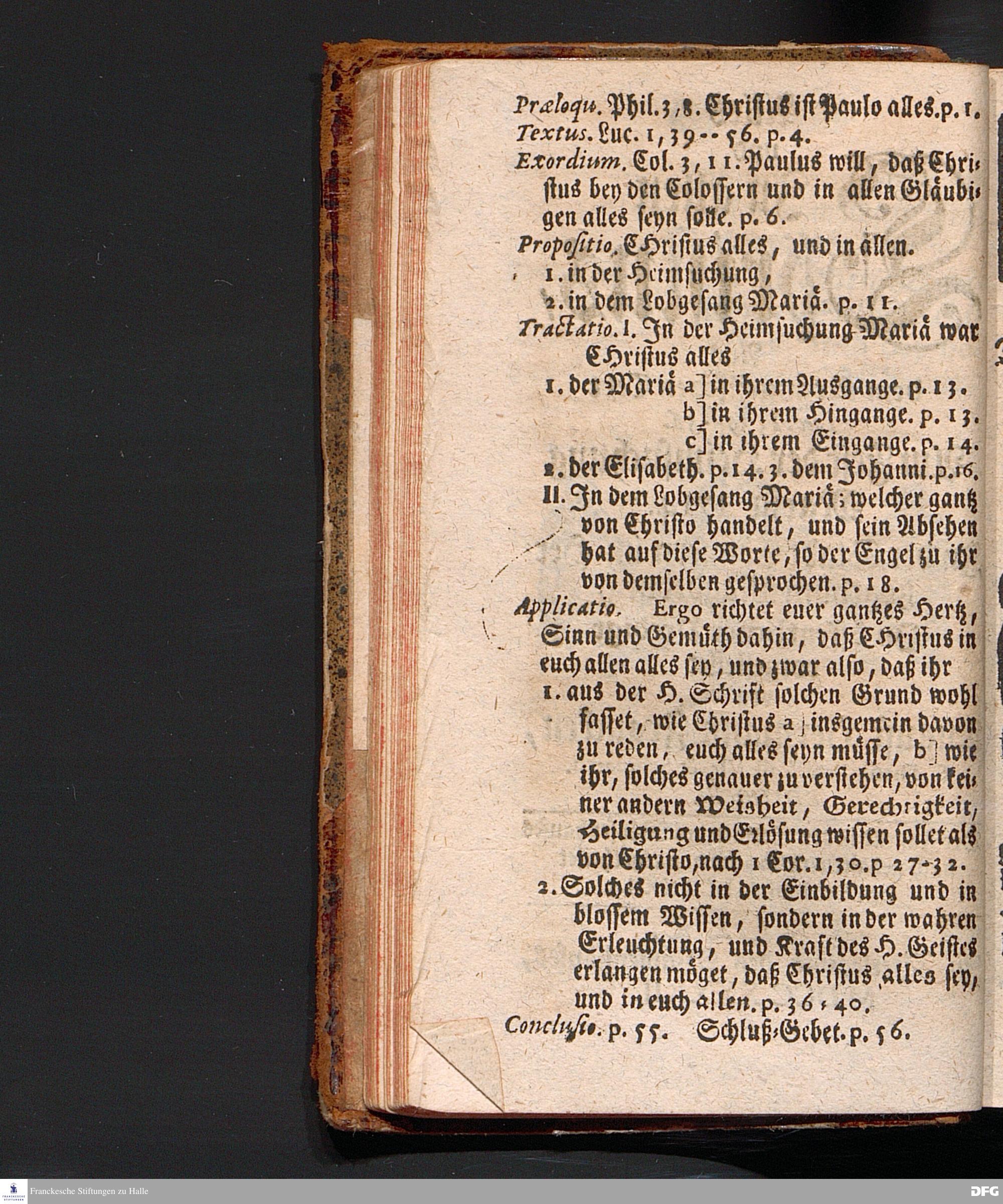 Alles und In allen Christus, Aus dem Evangelischen Text Luc.I, 39--56. Am Fest der Heimsuchung Mariä 1714. In der Stadt Cönnern im Hertzogthum Magdeburg, In öffentlicher Predigt vorgestellet von August Hermann Francken, S.Theol.Prof.Past.Vlr.& Scholarch. EDITIO III. Der Jugend in den Schulen des Wäysenhauses nach gehaltenem Examine ausgetheilet den 25.Iulii MDCCXXII. HALLE, In Verlegung des Wäysenhauses, MDCCXXXXII.