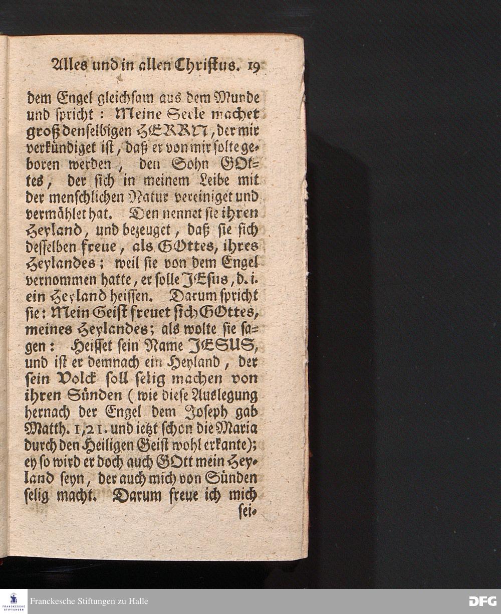 Alles und In allen Christus, Aus dem Evangelischen Text Luc.I, 39--56. Am Fest der Heimsuchung Mariä 1714. In der Stadt Cönnern im Hertzogthum Magdeburg, In öffentlicher Predigt vorgestellet von August Hermann Francken, S.Theol.Prof.Past.Vlr.& Scholarch. EDITIO III. Der Jugend in den Schulen des Wäysenhauses nach gehaltenem Examine ausgetheilet den 25.Iulii MDCCXXII. HALLE, In Verlegung des Wäysenhauses, MDCCXXXXII.