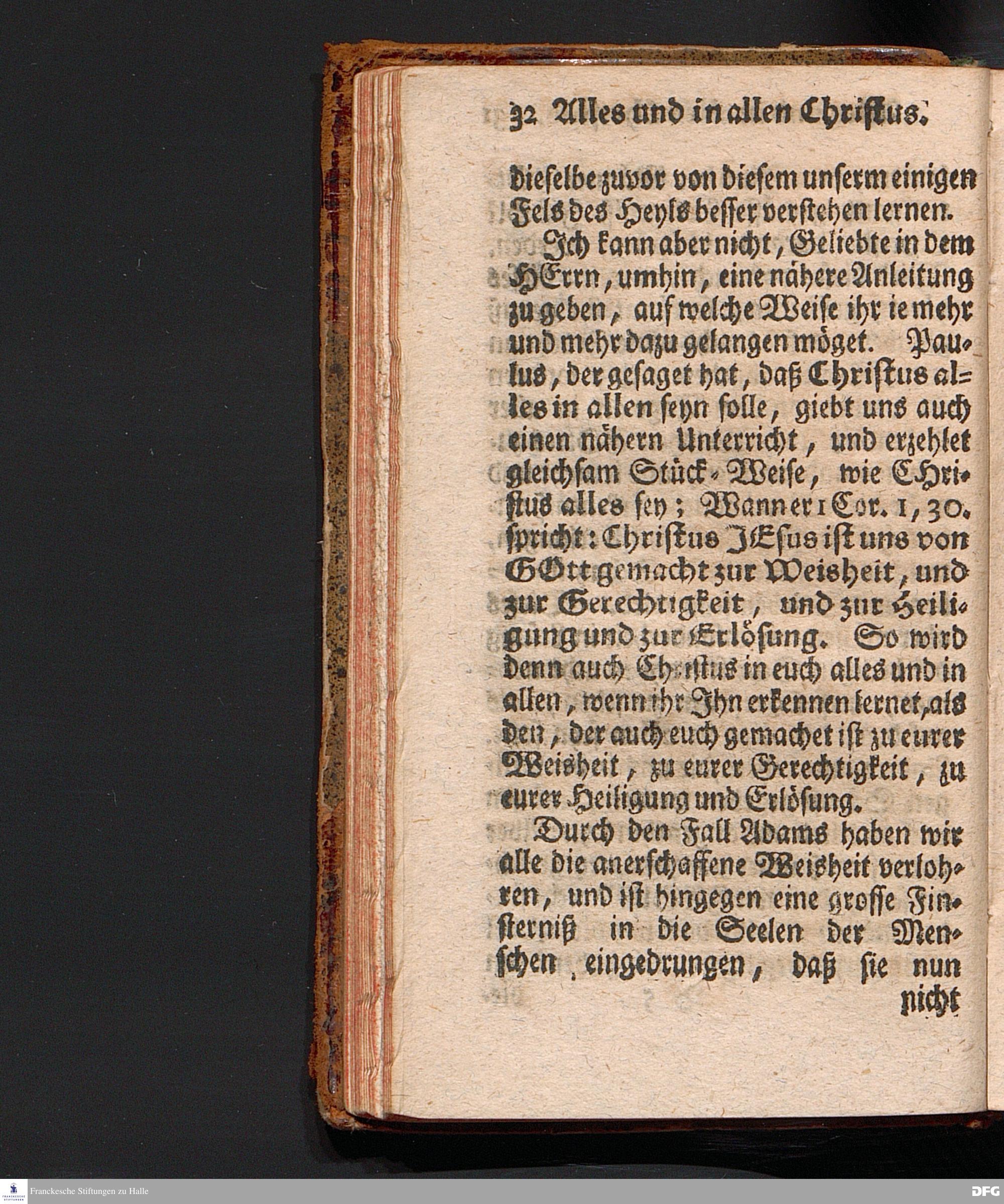 Alles und In allen Christus, Aus dem Evangelischen Text Luc.I, 39--56. Am Fest der Heimsuchung Mariä 1714. In der Stadt Cönnern im Hertzogthum Magdeburg, In öffentlicher Predigt vorgestellet von August Hermann Francken, S.Theol.Prof.Past.Vlr.& Scholarch. EDITIO III. Der Jugend in den Schulen des Wäysenhauses nach gehaltenem Examine ausgetheilet den 25.Iulii MDCCXXII. HALLE, In Verlegung des Wäysenhauses, MDCCXXXXII.