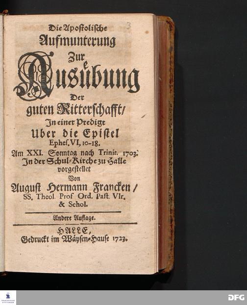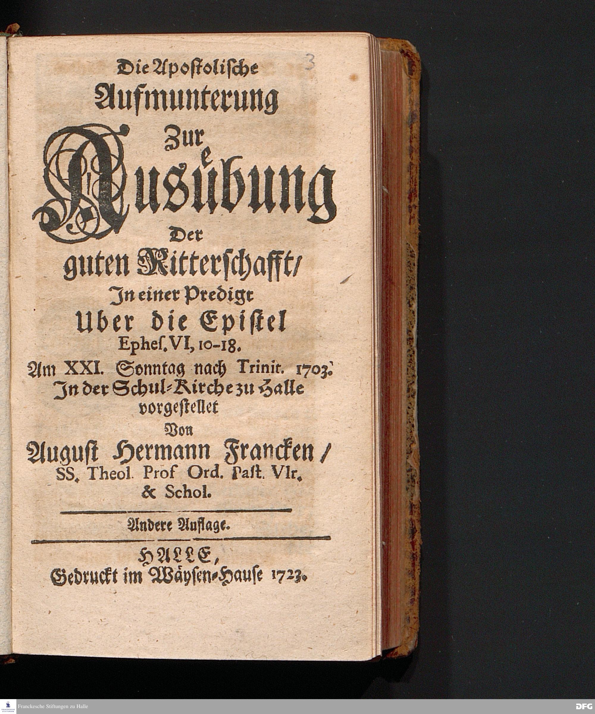 Die Apostolische Aufmunterung Zur Ausübung Der guten Ritterschafft / In einer Predigt Uber die Epistel Ephes.VI, 10-18. Am XXI.Sonntag nach Trinit. 1703. In der Schul=Kirche zu Halle vorgestellet Von August Hermann Francken / SS.Theol.Prof.Ord.Past.Vlr. & Schol. Andere Auflage. HALLE, Gedruckt im Wäysen=Hause Anno 1723.