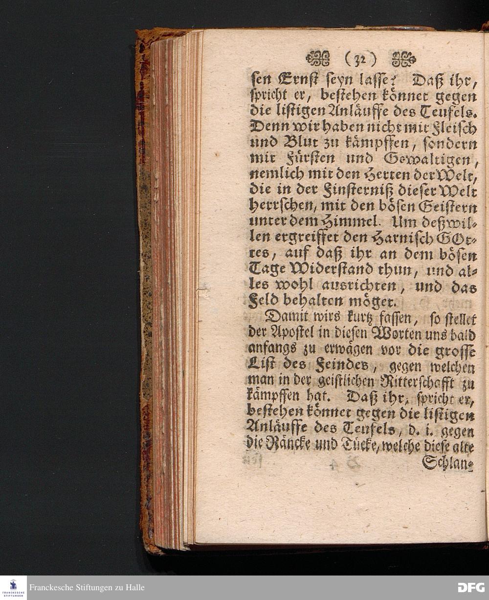 Die Apostolische Aufmunterung Zur Ausübung Der guten Ritterschafft / In einer Predigt Uber die Epistel Ephes.VI, 10-18. Am XXI.Sonntag nach Trinit. 1703. In der Schul=Kirche zu Halle vorgestellet Von August Hermann Francken / SS.Theol.Prof.Ord.Past.Vlr. & Schol. Andere Auflage. HALLE, Gedruckt im Wäysen=Hause Anno 1723.