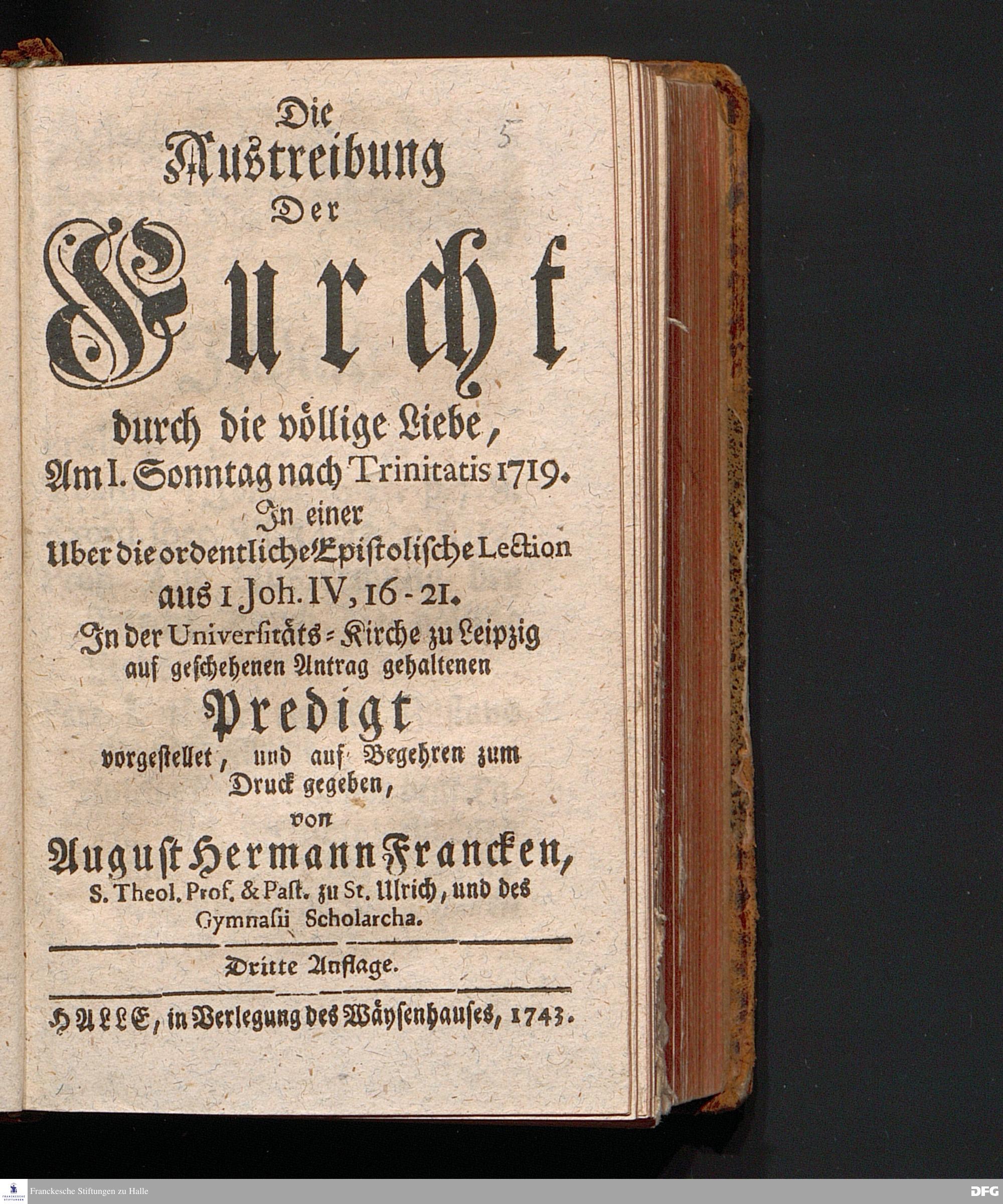 Die Austreibung Der Furcht durch die völlige Liebe, Am I.Sonntag nach Trinitatis 1719. In einer Uber die ordentliche Epistolische Lection aus I Joh.IV, 16-21. In der Universitäts=Kirche zu Leipzig auf geschehenen Antrag gehaltenen Predigt vorgestellet, und auf Begehren zum Druck gegeben, von August Hermann Francken, S.Theol.Prof.& Past.zu St.Ulrich, und des Gymnasii Scholarcha. Dritte Auflage. HALLE, in Verlegung des Wäysenhauses, 1743.