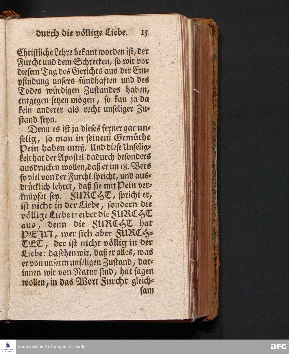 Die Austreibung Der Furcht durch die völlige Liebe, Am I.Sonntag nach Trinitatis 1719. In einer Uber die ordentliche Epistolische Lection aus I Joh.IV, 16-21. In der Universitäts=Kirche zu Leipzig auf geschehenen Antrag gehaltenen Predigt vorgestellet, und auf Begehren zum Druck gegeben, von August Hermann Francken, S.Theol.Prof.& Past.zu St.Ulrich, und des Gymnasii Scholarcha. Dritte Auflage. HALLE, in Verlegung des Wäysenhauses, 1743.