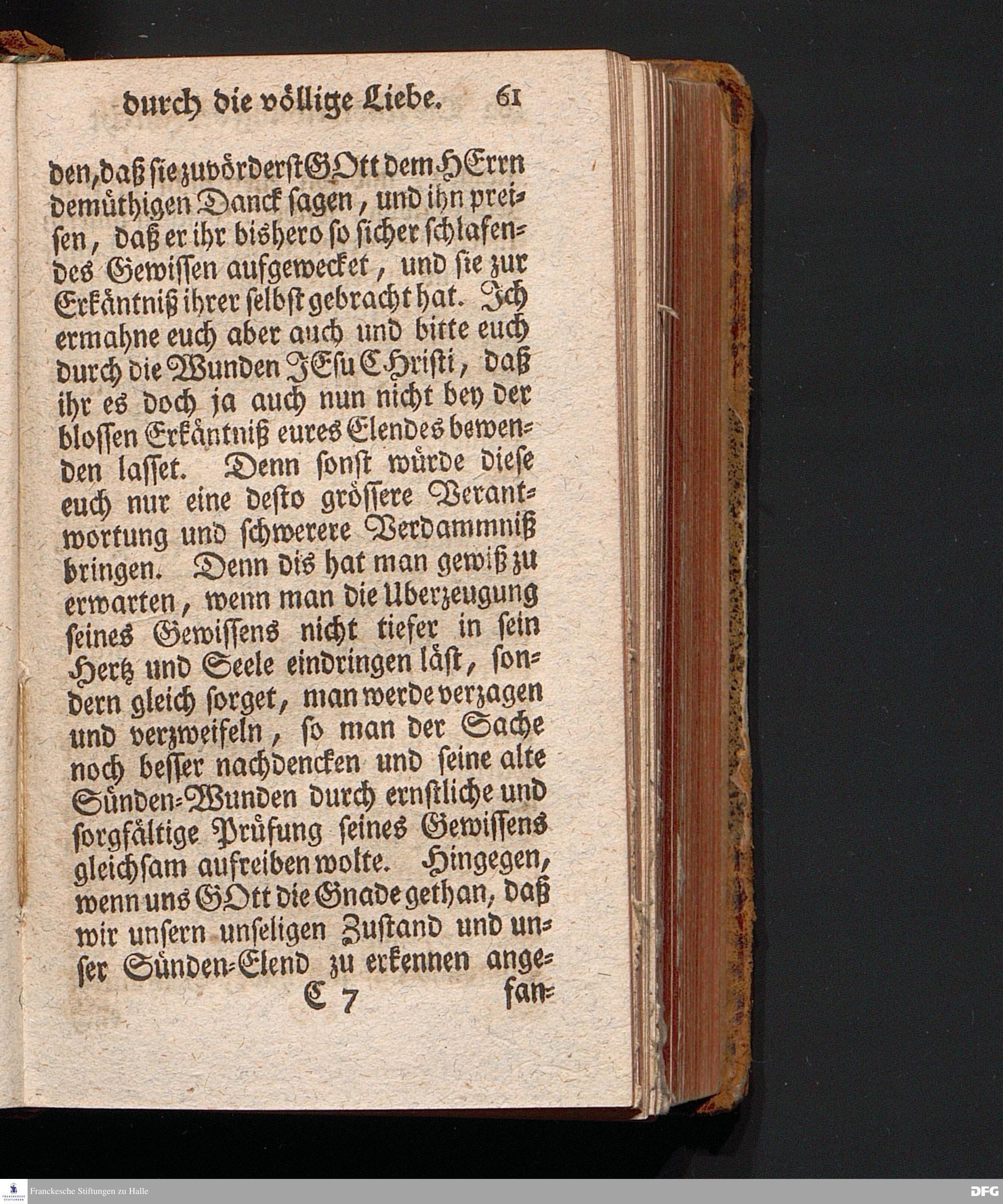 Die Austreibung Der Furcht durch die völlige Liebe, Am I.Sonntag nach Trinitatis 1719. In einer Uber die ordentliche Epistolische Lection aus I Joh.IV, 16-21. In der Universitäts=Kirche zu Leipzig auf geschehenen Antrag gehaltenen Predigt vorgestellet, und auf Begehren zum Druck gegeben, von August Hermann Francken, S.Theol.Prof.& Past.zu St.Ulrich, und des Gymnasii Scholarcha. Dritte Auflage. HALLE, in Verlegung des Wäysenhauses, 1743.
