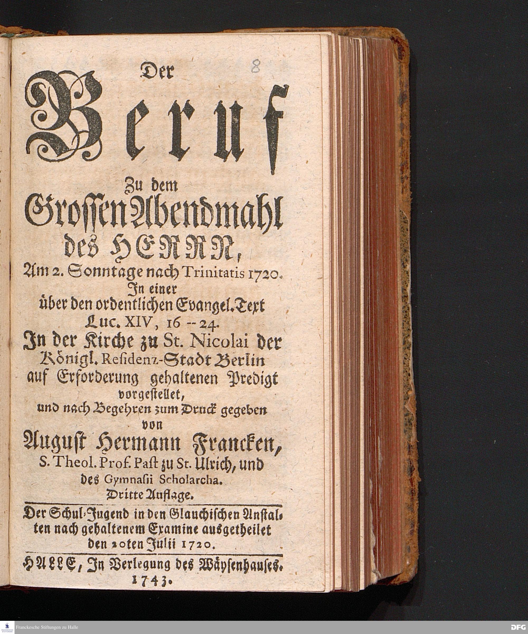 Der Beruf Zu dem Grossen Abendmahl des HERRN, Am 2.Sonntage nach Trinitatis 1720. In einer über den ordentlichen Evangel.Text Luc.XIV, 16--24. In der Kirche zu St.Nicolai der Königl.Residenz-Stadt Berlin auf Erforderung gehaltenen Predigt vorgestellet, und nach Begehren zum Druck gegeben von August Hermann Francken, S.Theol.Prof.Past.zu St.Ulrich, und des Gymnasii Scholarcha. Dritte Auflage. Der Schul=Jugend in den Glauchischen Anstalten nach gehaltenem Examine ausgetheilet den 20ten Julii 1720. HALLE, In Verlegung des Wäysenhauses. 1743.