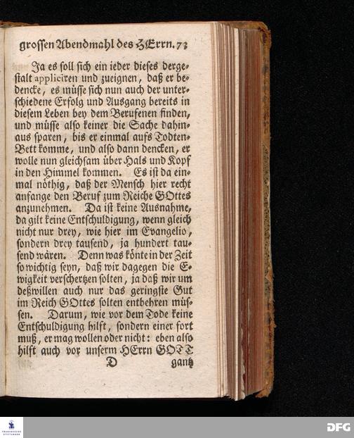 Der Beruf Zu dem Grossen Abendmahl des HERRN, Am 2.Sonntage nach Trinitatis 1720. In einer über den ordentlichen Evangel.Text Luc.XIV, 16--24. In der Kirche zu St.Nicolai der Königl.Residenz-Stadt Berlin auf Erforderung gehaltenen Predigt vorgestellet, und nach Begehren zum Druck gegeben von August Hermann Francken, S.Theol.Prof.Past.zu St.Ulrich, und des Gymnasii Scholarcha. Dritte Auflage. Der Schul=Jugend in den Glauchischen Anstalten nach gehaltenem Examine ausgetheilet den 20ten Julii 1720. HALLE, In Verlegung des Wäysenhauses. 1743.