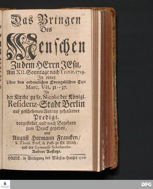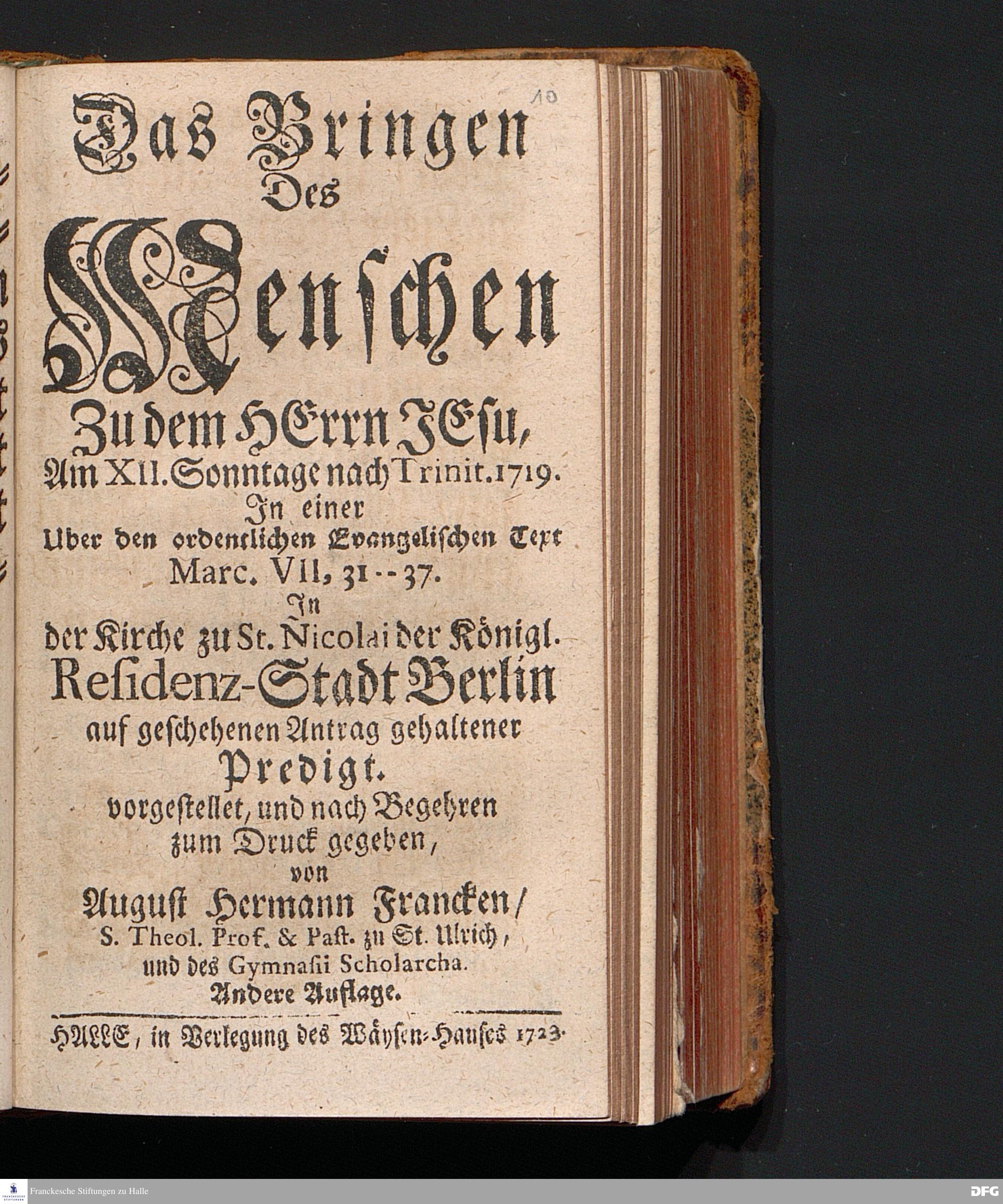 Das Bringen Des Menschen Zu dem HErrn JEsu, Am XII.Sonntage nach Trinit.1719. In einer Uber den ordentlichen Evangelischen Text Marc.VII, 31--37. In der Kirche zu St.Nicolai der Königl. Residenz-Stadt Berlin auf geschehenen Antrag gehaltener Predigt. vorgestellet, und nach Begehren zum Druck gegeben, von August Hermann Francken / S.Theol.Prof.& Past.zu St.Ulrich, und des Gymnasii Scholarcha. Andere Auflage. HALLE, in Verlegung des Wäysen=Hauses 1723.