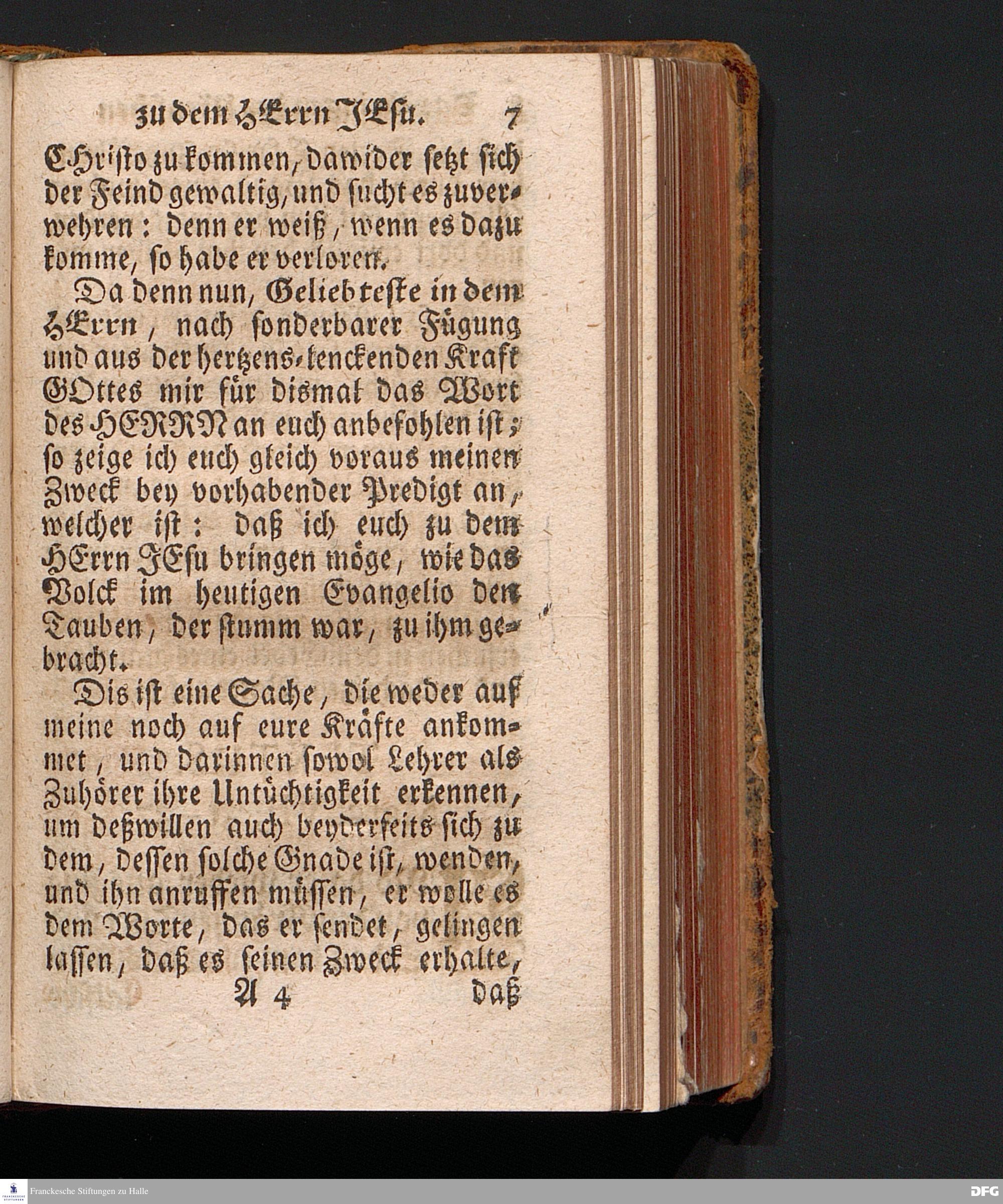 Das Bringen Des Menschen Zu dem HErrn JEsu, Am XII.Sonntage nach Trinit.1719. In einer Uber den ordentlichen Evangelischen Text Marc.VII, 31--37. In der Kirche zu St.Nicolai der Königl. Residenz-Stadt Berlin auf geschehenen Antrag gehaltener Predigt. vorgestellet, und nach Begehren zum Druck gegeben, von August Hermann Francken / S.Theol.Prof.& Past.zu St.Ulrich, und des Gymnasii Scholarcha. Andere Auflage. HALLE, in Verlegung des Wäysen=Hauses 1723.