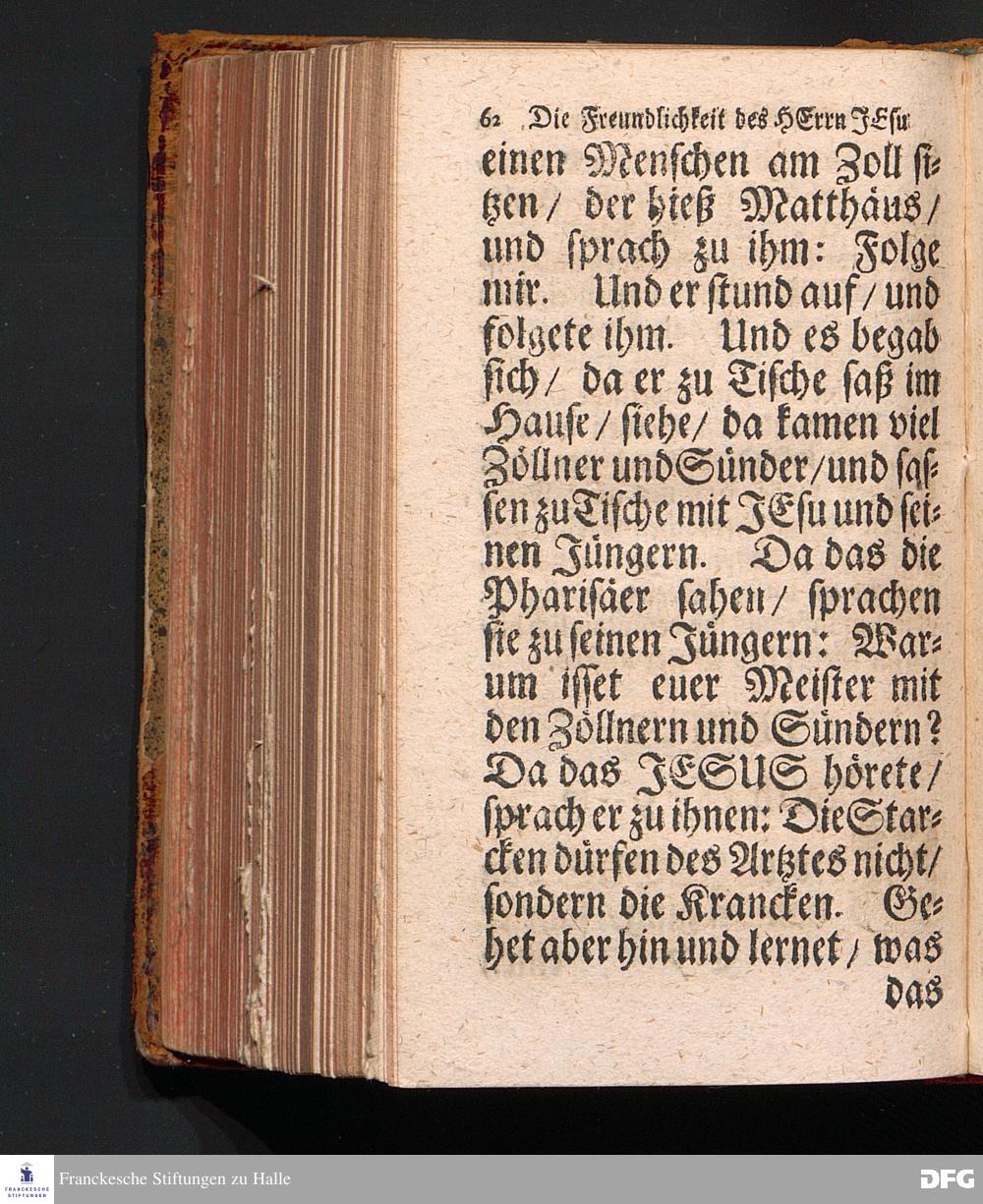 Die Freundlichkeit des HErrn JESU in Aufnehmung der Sünder / Am Tag des Apostels Matthäi 1717. Aus dem ordentlichen Evangelio Matth.IX, 9--13. In der Fürstl.Nassauischen Residentz Idstein bey der damaligen Durchreise in einer auf Verlangen gehaltenen Predigt vorgestellet von August Hermann Francken. [1720]