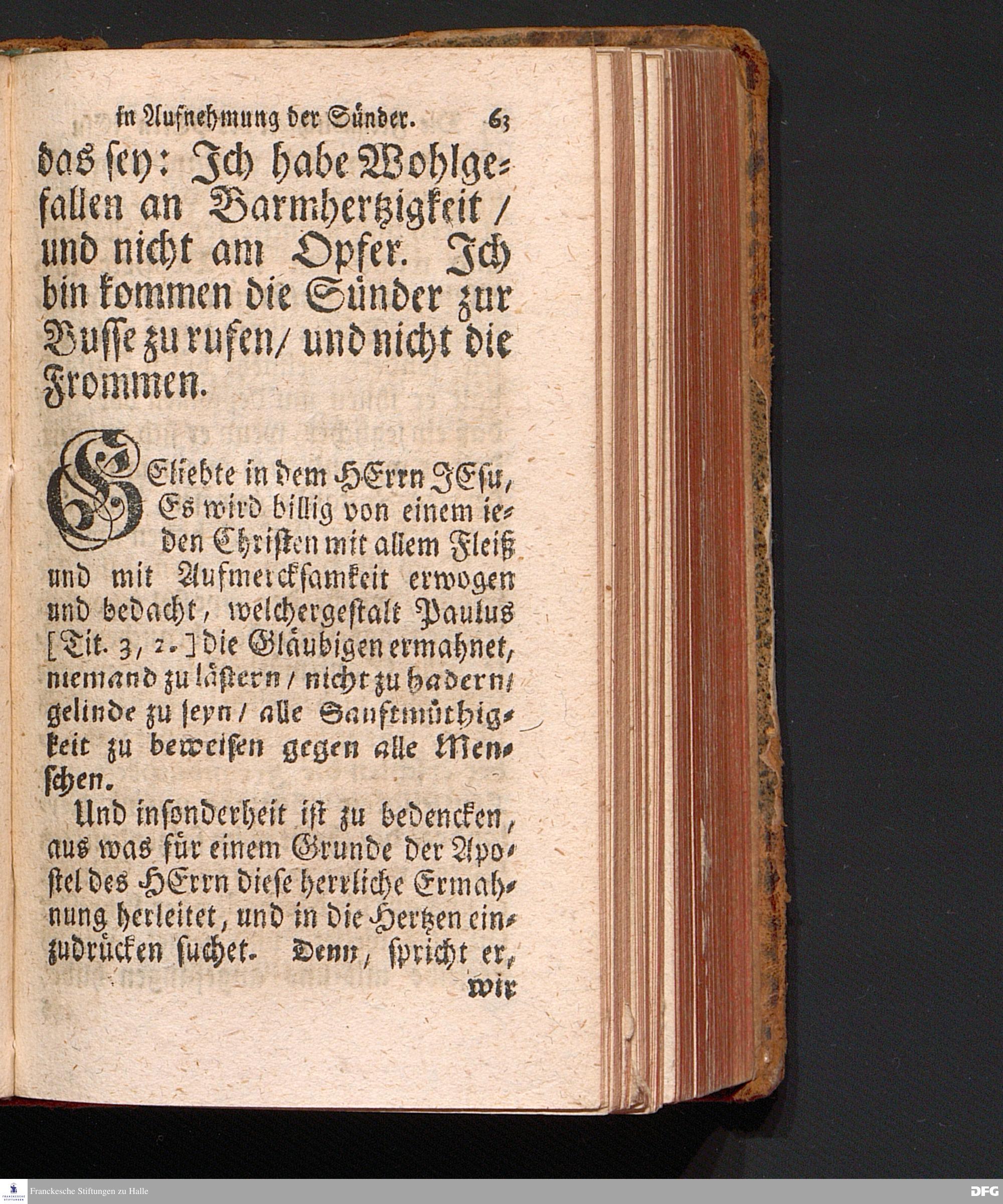 Die Freundlichkeit des HErrn JESU in Aufnehmung der Sünder / Am Tag des Apostels Matthäi 1717. Aus dem ordentlichen Evangelio Matth.IX, 9--13. In der Fürstl.Nassauischen Residentz Idstein bey der damaligen Durchreise in einer auf Verlangen gehaltenen Predigt vorgestellet von August Hermann Francken. [1720]