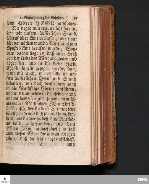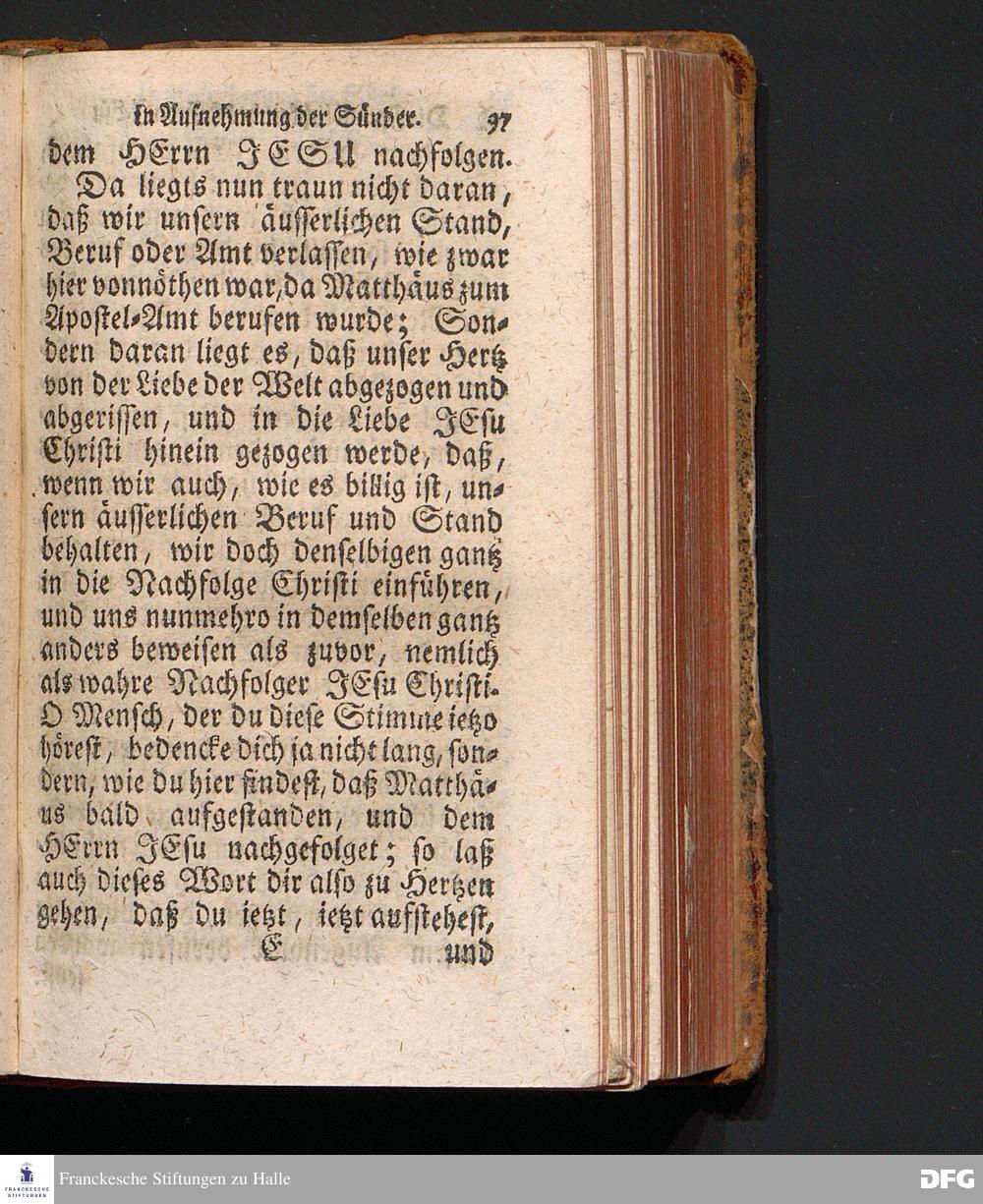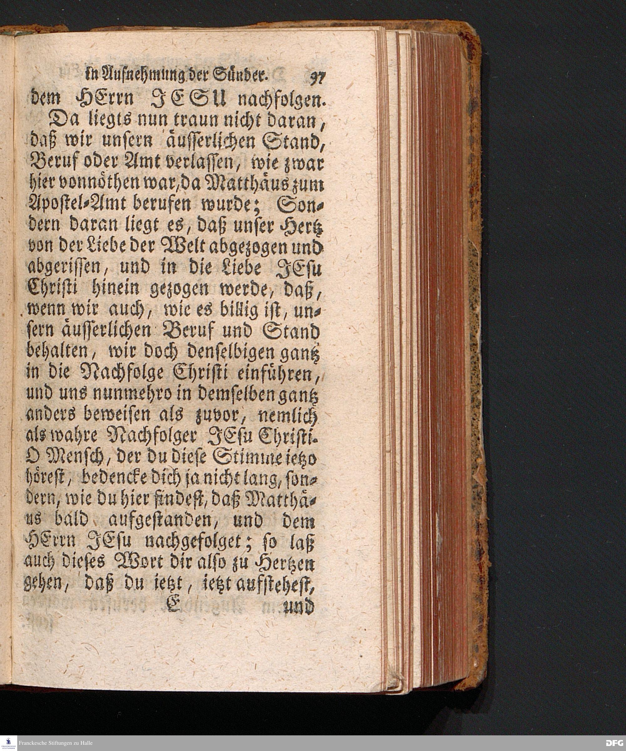 Die Freundlichkeit des HErrn JESU in Aufnehmung der Sünder / Am Tag des Apostels Matthäi 1717. Aus dem ordentlichen Evangelio Matth.IX, 9--13. In der Fürstl.Nassauischen Residentz Idstein bey der damaligen Durchreise in einer auf Verlangen gehaltenen Predigt vorgestellet von August Hermann Francken. [1720]