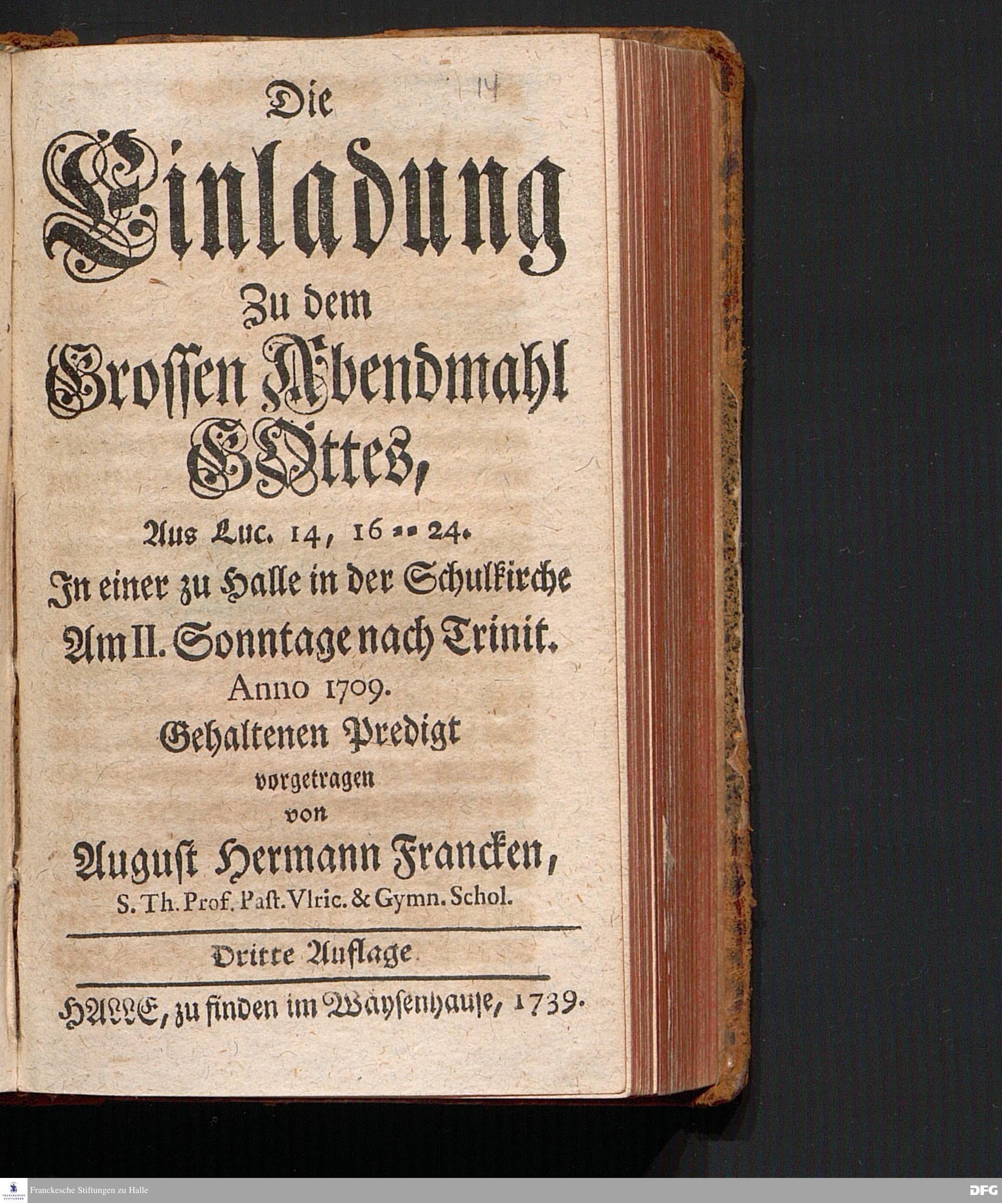 Die Einladung Zu dem Grossen Abendmahl GOttes, Aus Luc.14, 16==24. In einer zu Halle in der Schulkirche Am II.Sonntage nach Trinit. Anno 1709. Gehaltenen Predigt vorgetragen von August Hermann Francken, S.Th.Prof.Past.Vlric.& Gymn.Schol. Dritte Auflage. HALLE, zu finden im Wäysenhause, 1739.