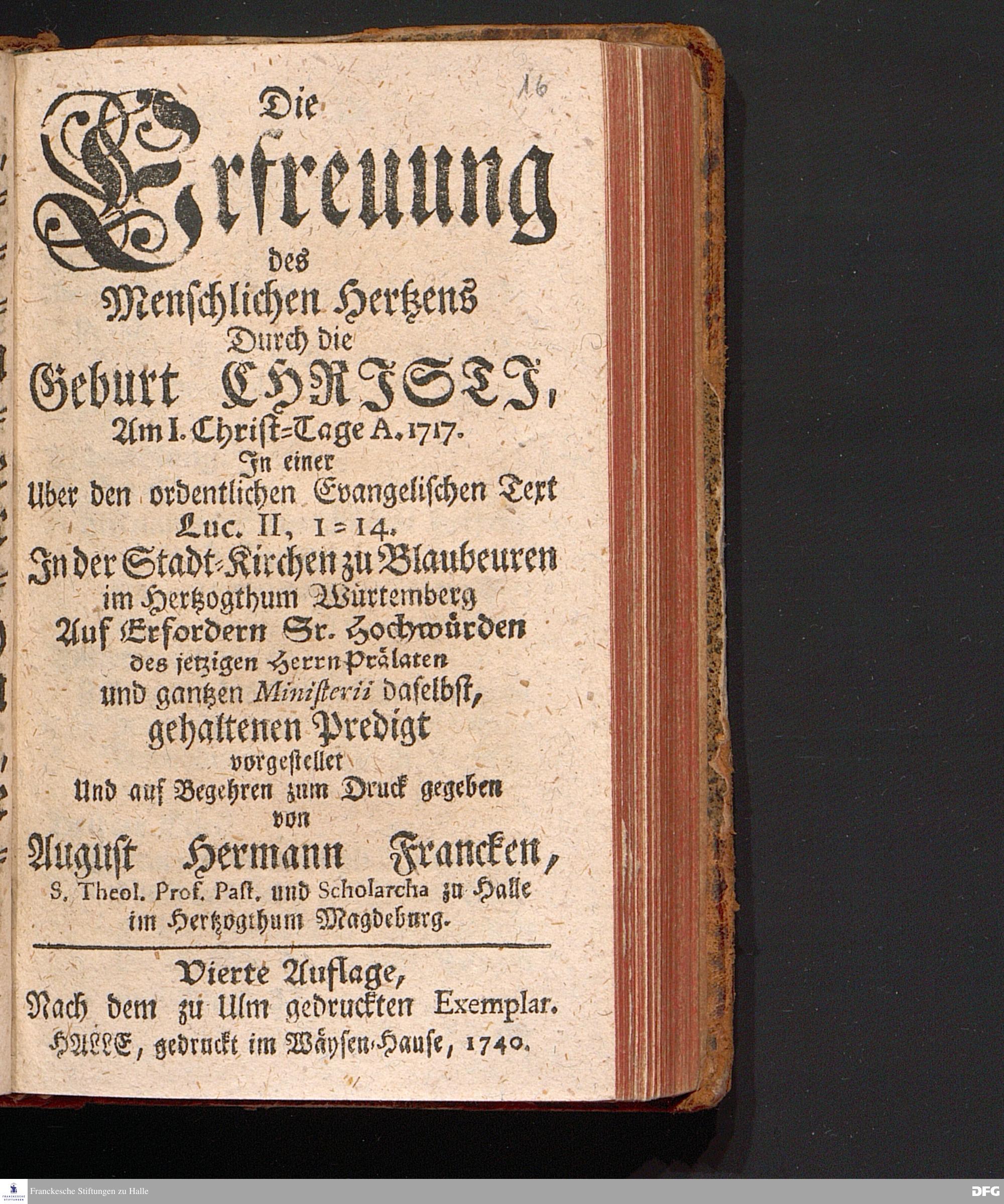 Die Erfreuung des Menschlichen Hertzens Durch die Geburt CHRISTI, Am I.Christ=Tage A.1717. In einer Uber den ordentlichen Evangelischen Text Luc.II, 1=14. In der Stadt=Kirchen zu Blaubeuren im Hertzogthum Würtemberg Auf Erfordern Sr.Hochwürden des jetzigen Herrn Prälaten und gantzen Ministerii daselbst, gehaltenen Predigt vorgestellet Und auf Begehren zum Druck gegeben von August Hermann Francken, S.Theol.Prof.Past.und Scholarcha zu Halle im Hertzogthum Magdeburg. Vierte Auflage, Nach dem zu Ulm gedruckten Exemplar. HALLE, gedruckt im Wäysen=Hause, 1740.