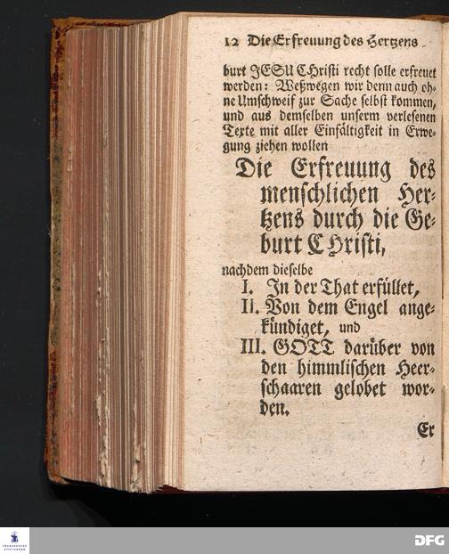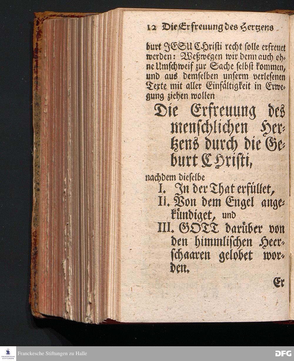 Die Erfreuung des Menschlichen Hertzens Durch die Geburt CHRISTI, Am I.Christ=Tage A.1717. In einer Uber den ordentlichen Evangelischen Text Luc.II, 1=14. In der Stadt=Kirchen zu Blaubeuren im Hertzogthum Würtemberg Auf Erfordern Sr.Hochwürden des jetzigen Herrn Prälaten und gantzen Ministerii daselbst, gehaltenen Predigt vorgestellet Und auf Begehren zum Druck gegeben von August Hermann Francken, S.Theol.Prof.Past.und Scholarcha zu Halle im Hertzogthum Magdeburg. Vierte Auflage, Nach dem zu Ulm gedruckten Exemplar. HALLE, gedruckt im Wäysen=Hause, 1740.