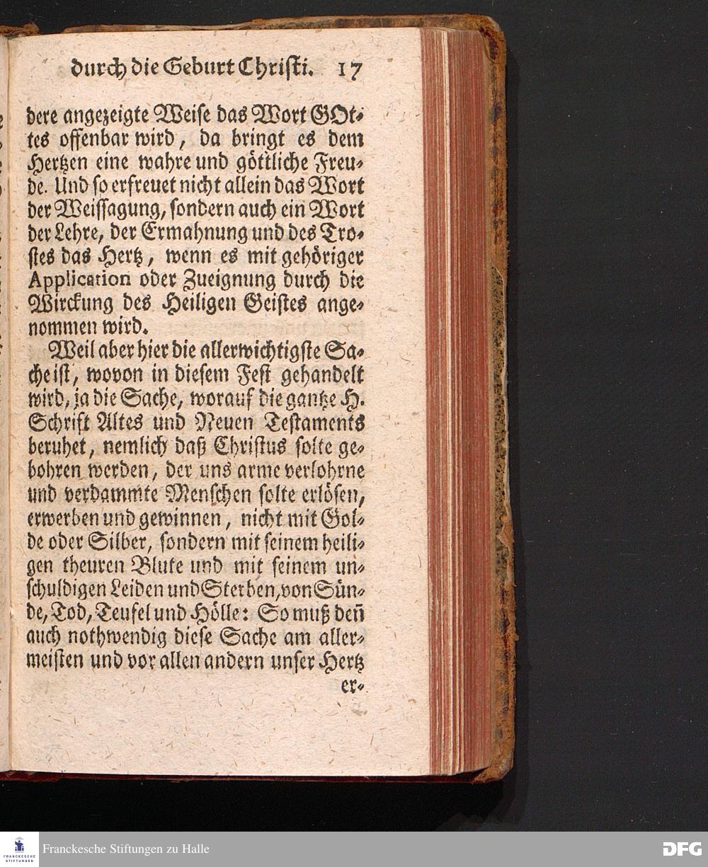 Die Erfreuung des Menschlichen Hertzens Durch die Geburt CHRISTI, Am I.Christ=Tage A.1717. In einer Uber den ordentlichen Evangelischen Text Luc.II, 1=14. In der Stadt=Kirchen zu Blaubeuren im Hertzogthum Würtemberg Auf Erfordern Sr.Hochwürden des jetzigen Herrn Prälaten und gantzen Ministerii daselbst, gehaltenen Predigt vorgestellet Und auf Begehren zum Druck gegeben von August Hermann Francken, S.Theol.Prof.Past.und Scholarcha zu Halle im Hertzogthum Magdeburg. Vierte Auflage, Nach dem zu Ulm gedruckten Exemplar. HALLE, gedruckt im Wäysen=Hause, 1740.