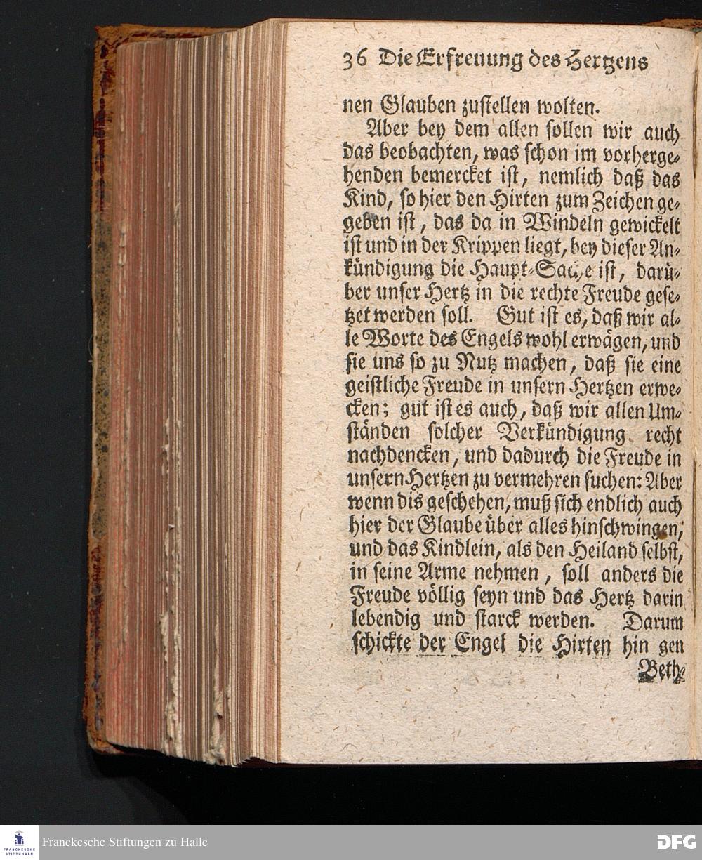 Die Erfreuung des Menschlichen Hertzens Durch die Geburt CHRISTI, Am I.Christ=Tage A.1717. In einer Uber den ordentlichen Evangelischen Text Luc.II, 1=14. In der Stadt=Kirchen zu Blaubeuren im Hertzogthum Würtemberg Auf Erfordern Sr.Hochwürden des jetzigen Herrn Prälaten und gantzen Ministerii daselbst, gehaltenen Predigt vorgestellet Und auf Begehren zum Druck gegeben von August Hermann Francken, S.Theol.Prof.Past.und Scholarcha zu Halle im Hertzogthum Magdeburg. Vierte Auflage, Nach dem zu Ulm gedruckten Exemplar. HALLE, gedruckt im Wäysen=Hause, 1740.
