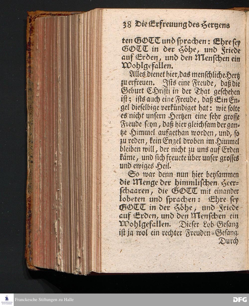 Die Erfreuung des Menschlichen Hertzens Durch die Geburt CHRISTI, Am I.Christ=Tage A.1717. In einer Uber den ordentlichen Evangelischen Text Luc.II, 1=14. In der Stadt=Kirchen zu Blaubeuren im Hertzogthum Würtemberg Auf Erfordern Sr.Hochwürden des jetzigen Herrn Prälaten und gantzen Ministerii daselbst, gehaltenen Predigt vorgestellet Und auf Begehren zum Druck gegeben von August Hermann Francken, S.Theol.Prof.Past.und Scholarcha zu Halle im Hertzogthum Magdeburg. Vierte Auflage, Nach dem zu Ulm gedruckten Exemplar. HALLE, gedruckt im Wäysen=Hause, 1740.
