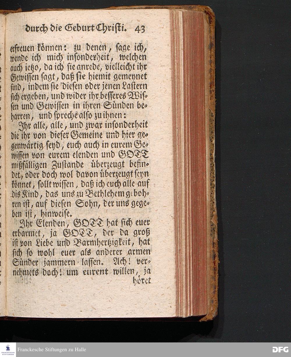 Die Erfreuung des Menschlichen Hertzens Durch die Geburt CHRISTI, Am I.Christ=Tage A.1717. In einer Uber den ordentlichen Evangelischen Text Luc.II, 1=14. In der Stadt=Kirchen zu Blaubeuren im Hertzogthum Würtemberg Auf Erfordern Sr.Hochwürden des jetzigen Herrn Prälaten und gantzen Ministerii daselbst, gehaltenen Predigt vorgestellet Und auf Begehren zum Druck gegeben von August Hermann Francken, S.Theol.Prof.Past.und Scholarcha zu Halle im Hertzogthum Magdeburg. Vierte Auflage, Nach dem zu Ulm gedruckten Exemplar. HALLE, gedruckt im Wäysen=Hause, 1740.
