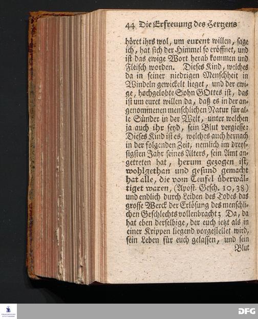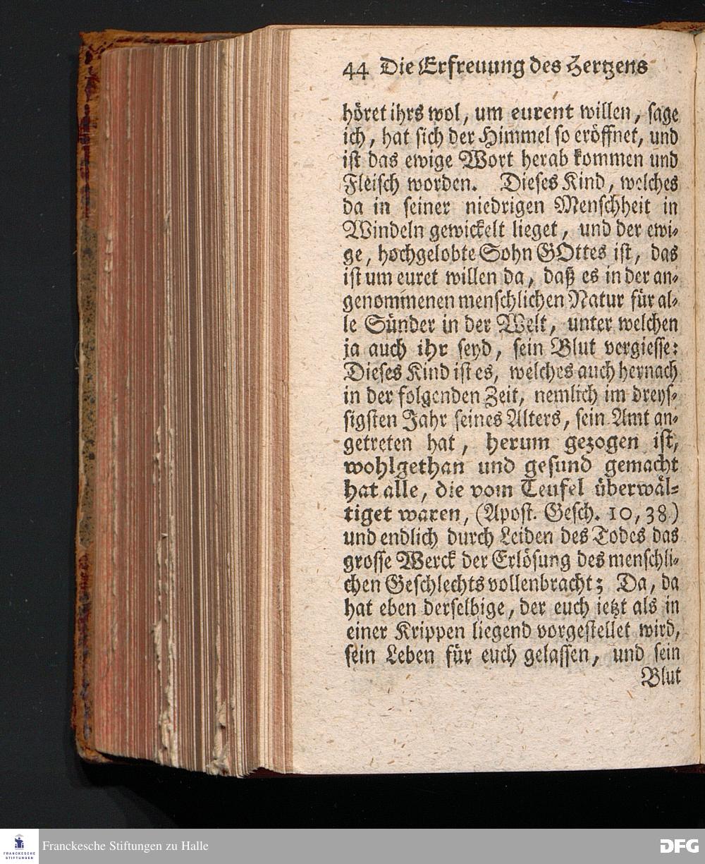 Die Erfreuung des Menschlichen Hertzens Durch die Geburt CHRISTI, Am I.Christ=Tage A.1717. In einer Uber den ordentlichen Evangelischen Text Luc.II, 1=14. In der Stadt=Kirchen zu Blaubeuren im Hertzogthum Würtemberg Auf Erfordern Sr.Hochwürden des jetzigen Herrn Prälaten und gantzen Ministerii daselbst, gehaltenen Predigt vorgestellet Und auf Begehren zum Druck gegeben von August Hermann Francken, S.Theol.Prof.Past.und Scholarcha zu Halle im Hertzogthum Magdeburg. Vierte Auflage, Nach dem zu Ulm gedruckten Exemplar. HALLE, gedruckt im Wäysen=Hause, 1740.