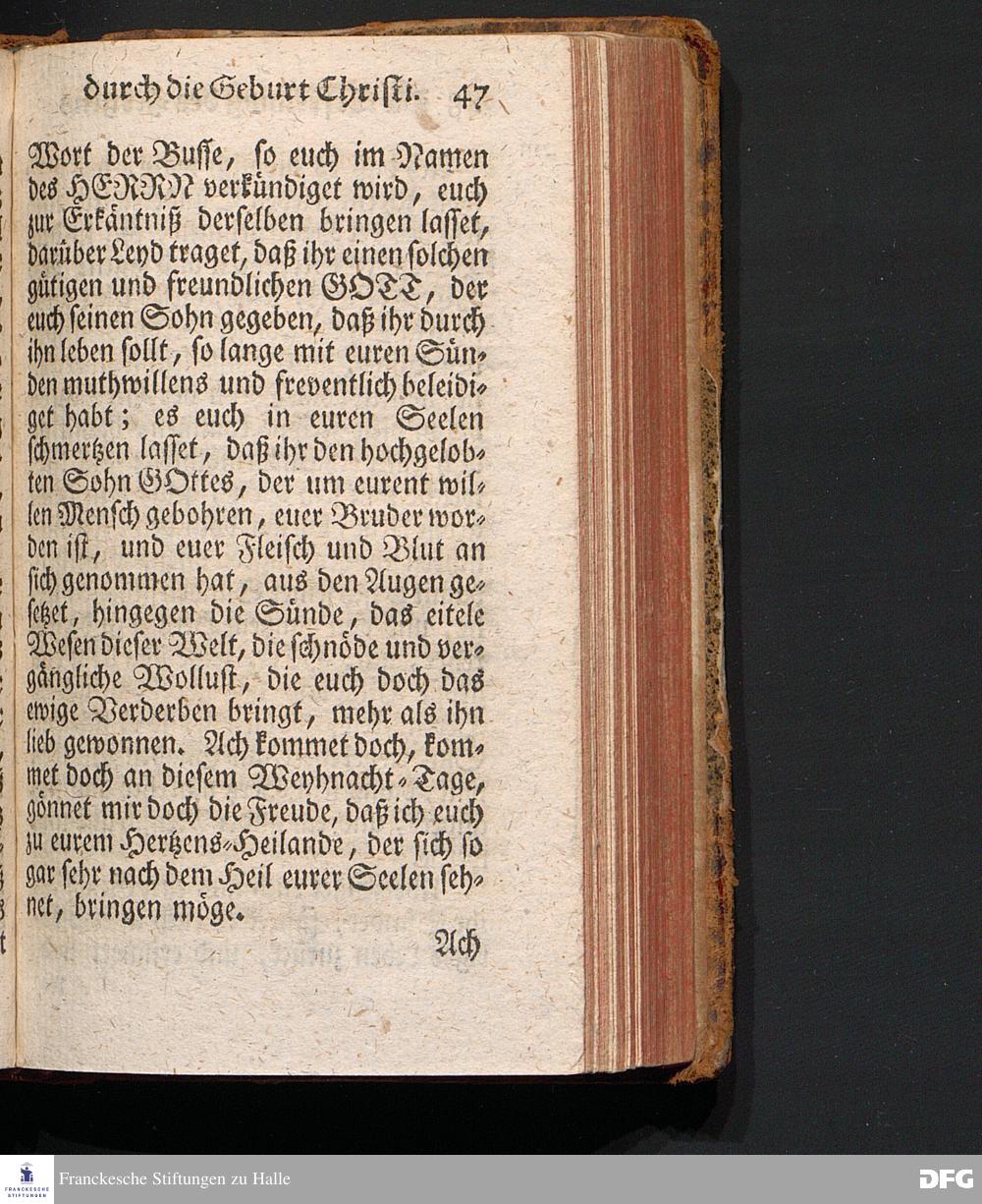 Die Erfreuung des Menschlichen Hertzens Durch die Geburt CHRISTI, Am I.Christ=Tage A.1717. In einer Uber den ordentlichen Evangelischen Text Luc.II, 1=14. In der Stadt=Kirchen zu Blaubeuren im Hertzogthum Würtemberg Auf Erfordern Sr.Hochwürden des jetzigen Herrn Prälaten und gantzen Ministerii daselbst, gehaltenen Predigt vorgestellet Und auf Begehren zum Druck gegeben von August Hermann Francken, S.Theol.Prof.Past.und Scholarcha zu Halle im Hertzogthum Magdeburg. Vierte Auflage, Nach dem zu Ulm gedruckten Exemplar. HALLE, gedruckt im Wäysen=Hause, 1740.