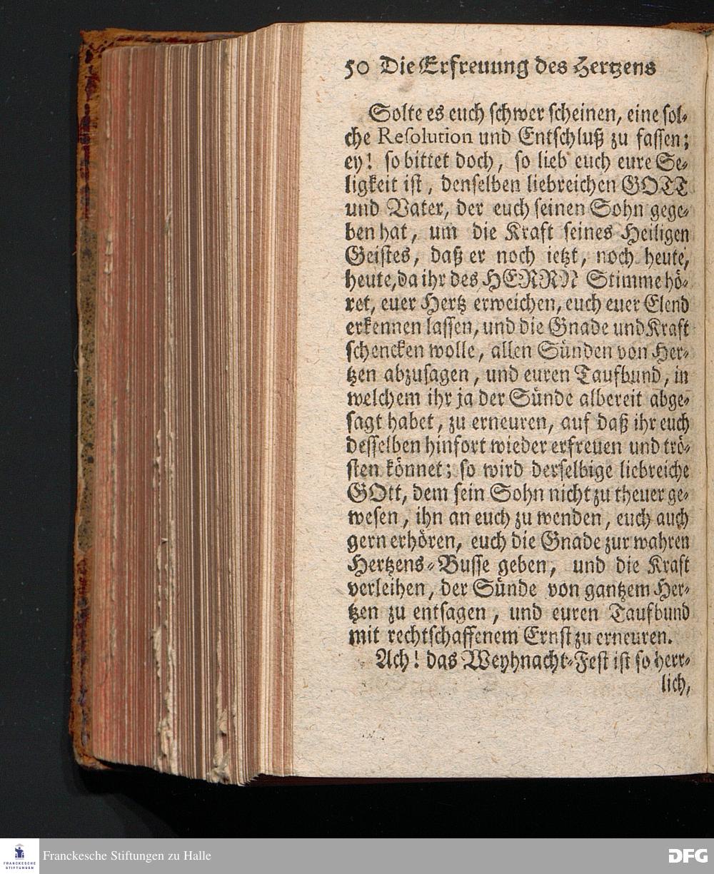 Die Erfreuung des Menschlichen Hertzens Durch die Geburt CHRISTI, Am I.Christ=Tage A.1717. In einer Uber den ordentlichen Evangelischen Text Luc.II, 1=14. In der Stadt=Kirchen zu Blaubeuren im Hertzogthum Würtemberg Auf Erfordern Sr.Hochwürden des jetzigen Herrn Prälaten und gantzen Ministerii daselbst, gehaltenen Predigt vorgestellet Und auf Begehren zum Druck gegeben von August Hermann Francken, S.Theol.Prof.Past.und Scholarcha zu Halle im Hertzogthum Magdeburg. Vierte Auflage, Nach dem zu Ulm gedruckten Exemplar. HALLE, gedruckt im Wäysen=Hause, 1740.
