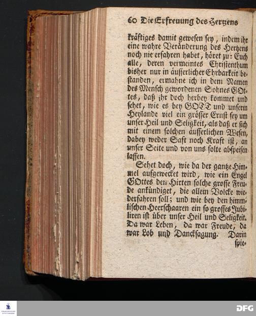 Die Erfreuung des Menschlichen Hertzens Durch die Geburt CHRISTI, Am I.Christ=Tage A.1717. In einer Uber den ordentlichen Evangelischen Text Luc.II, 1=14. In der Stadt=Kirchen zu Blaubeuren im Hertzogthum Würtemberg Auf Erfordern Sr.Hochwürden des jetzigen Herrn Prälaten und gantzen Ministerii daselbst, gehaltenen Predigt vorgestellet Und auf Begehren zum Druck gegeben von August Hermann Francken, S.Theol.Prof.Past.und Scholarcha zu Halle im Hertzogthum Magdeburg. Vierte Auflage, Nach dem zu Ulm gedruckten Exemplar. HALLE, gedruckt im Wäysen=Hause, 1740.