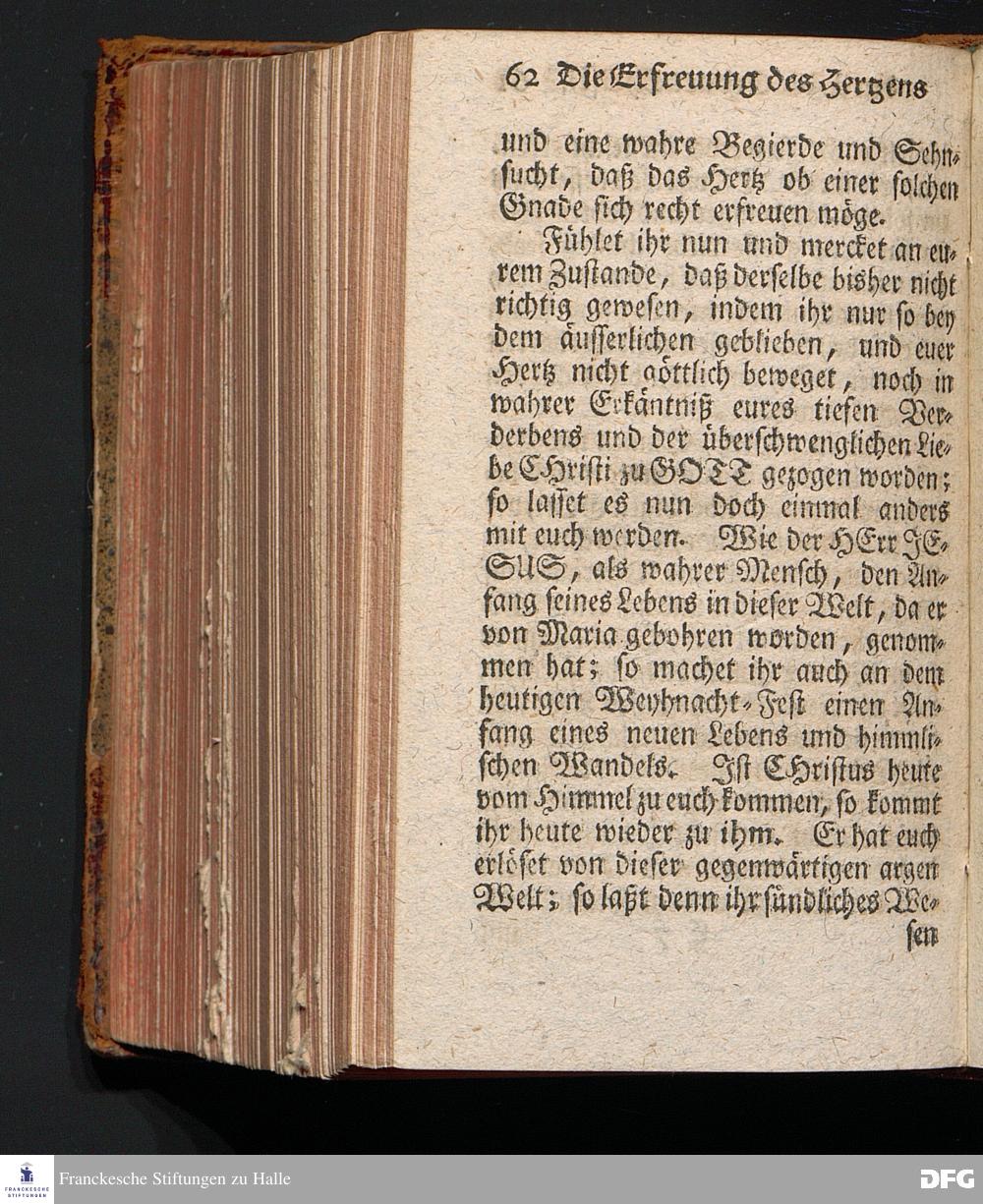 Die Erfreuung des Menschlichen Hertzens Durch die Geburt CHRISTI, Am I.Christ=Tage A.1717. In einer Uber den ordentlichen Evangelischen Text Luc.II, 1=14. In der Stadt=Kirchen zu Blaubeuren im Hertzogthum Würtemberg Auf Erfordern Sr.Hochwürden des jetzigen Herrn Prälaten und gantzen Ministerii daselbst, gehaltenen Predigt vorgestellet Und auf Begehren zum Druck gegeben von August Hermann Francken, S.Theol.Prof.Past.und Scholarcha zu Halle im Hertzogthum Magdeburg. Vierte Auflage, Nach dem zu Ulm gedruckten Exemplar. HALLE, gedruckt im Wäysen=Hause, 1740.