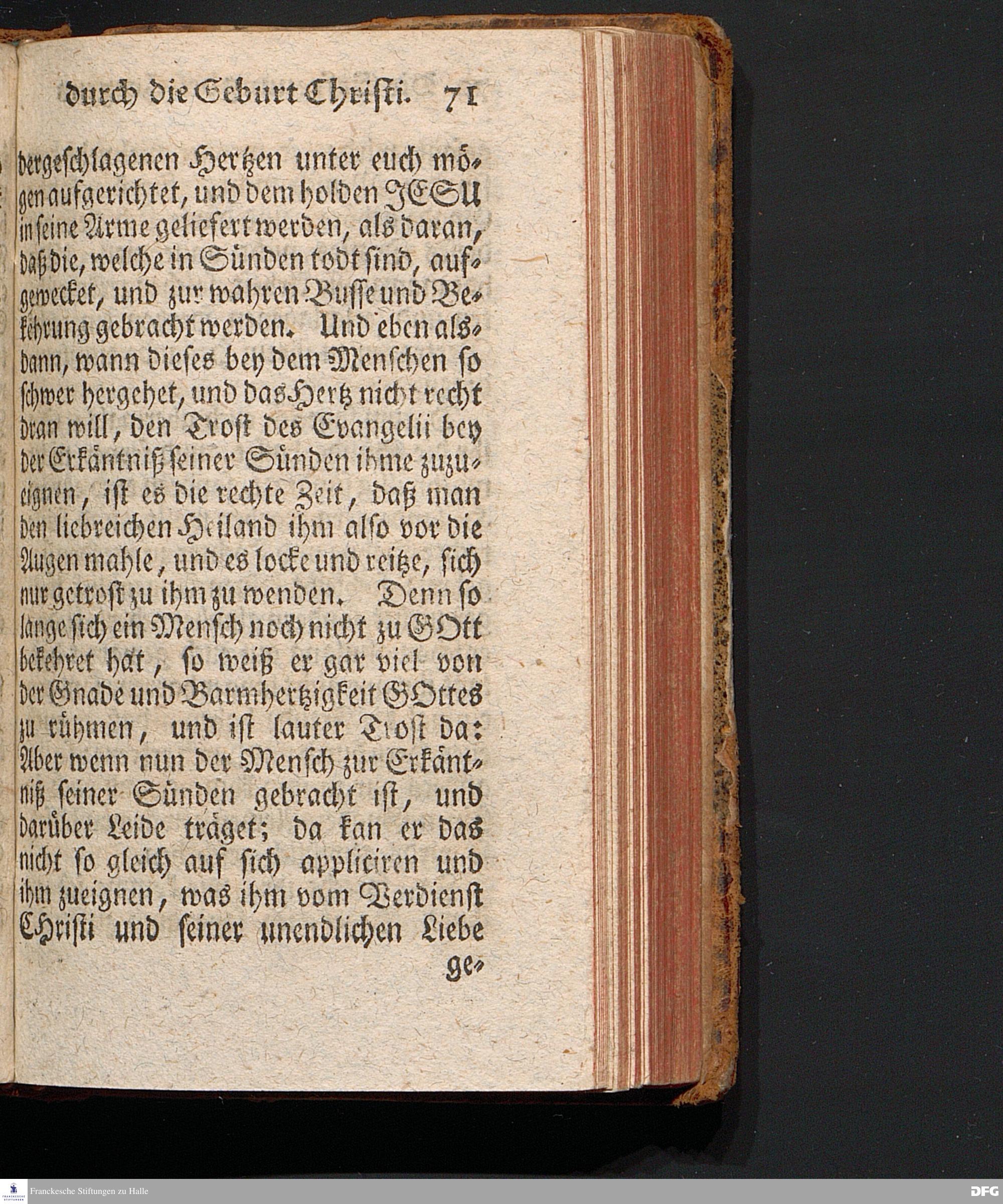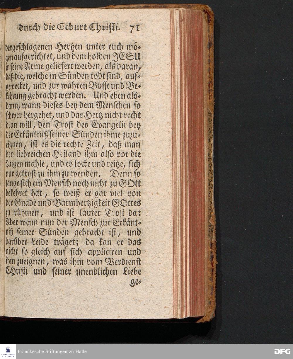 Die Erfreuung des Menschlichen Hertzens Durch die Geburt CHRISTI, Am I.Christ=Tage A.1717. In einer Uber den ordentlichen Evangelischen Text Luc.II, 1=14. In der Stadt=Kirchen zu Blaubeuren im Hertzogthum Würtemberg Auf Erfordern Sr.Hochwürden des jetzigen Herrn Prälaten und gantzen Ministerii daselbst, gehaltenen Predigt vorgestellet Und auf Begehren zum Druck gegeben von August Hermann Francken, S.Theol.Prof.Past.und Scholarcha zu Halle im Hertzogthum Magdeburg. Vierte Auflage, Nach dem zu Ulm gedruckten Exemplar. HALLE, gedruckt im Wäysen=Hause, 1740.