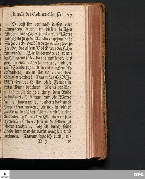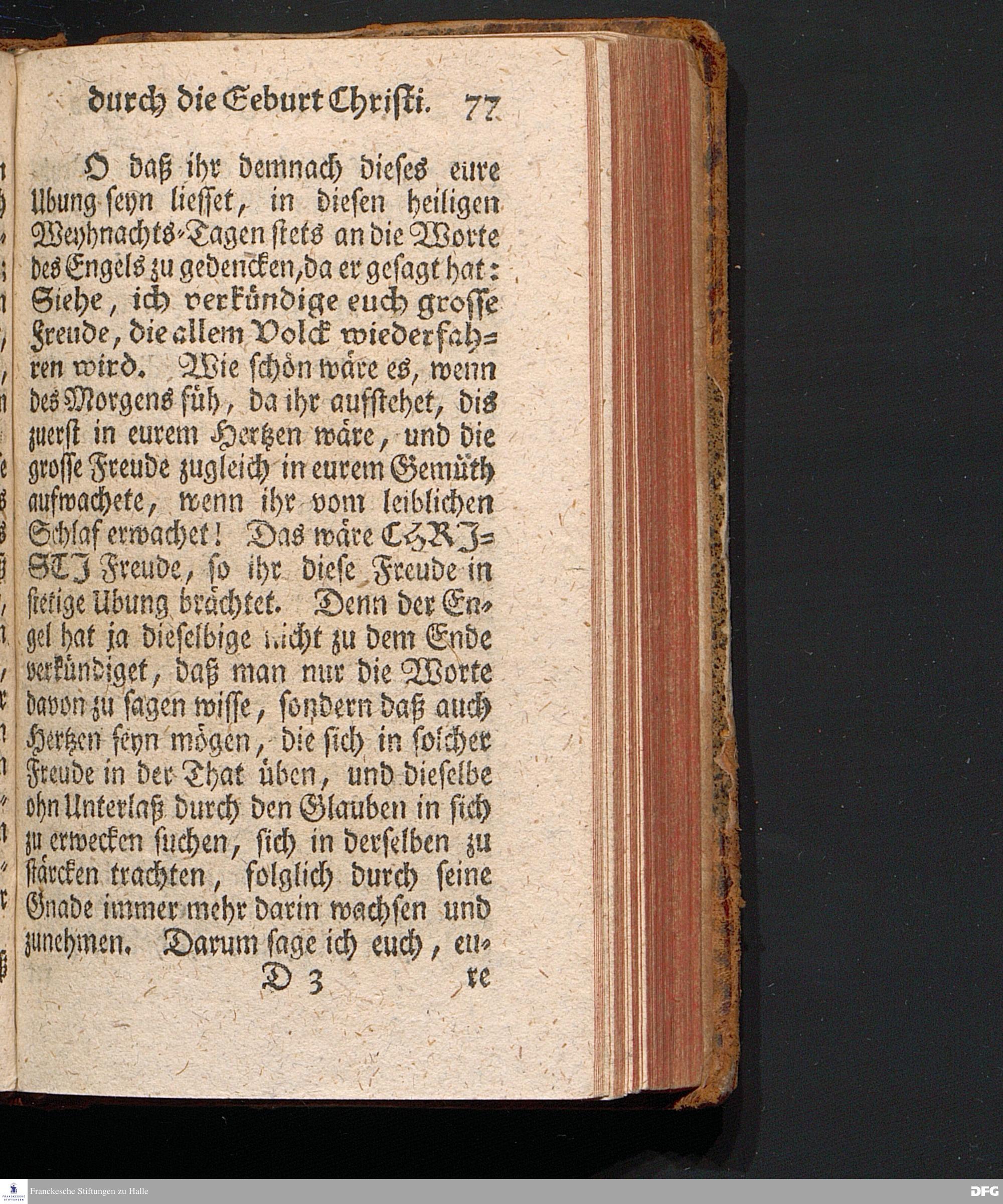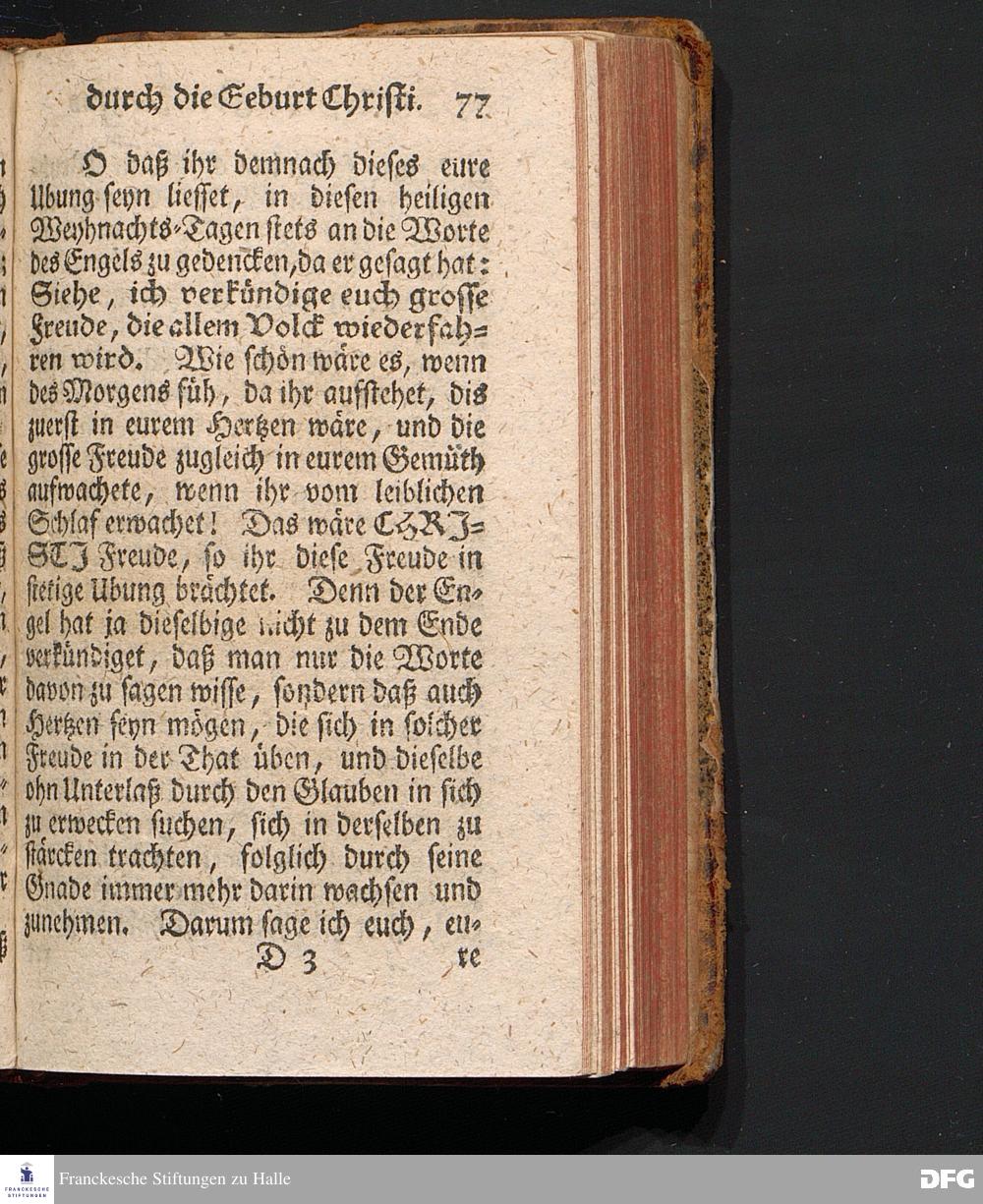 Die Erfreuung des Menschlichen Hertzens Durch die Geburt CHRISTI, Am I.Christ=Tage A.1717. In einer Uber den ordentlichen Evangelischen Text Luc.II, 1=14. In der Stadt=Kirchen zu Blaubeuren im Hertzogthum Würtemberg Auf Erfordern Sr.Hochwürden des jetzigen Herrn Prälaten und gantzen Ministerii daselbst, gehaltenen Predigt vorgestellet Und auf Begehren zum Druck gegeben von August Hermann Francken, S.Theol.Prof.Past.und Scholarcha zu Halle im Hertzogthum Magdeburg. Vierte Auflage, Nach dem zu Ulm gedruckten Exemplar. HALLE, gedruckt im Wäysen=Hause, 1740.