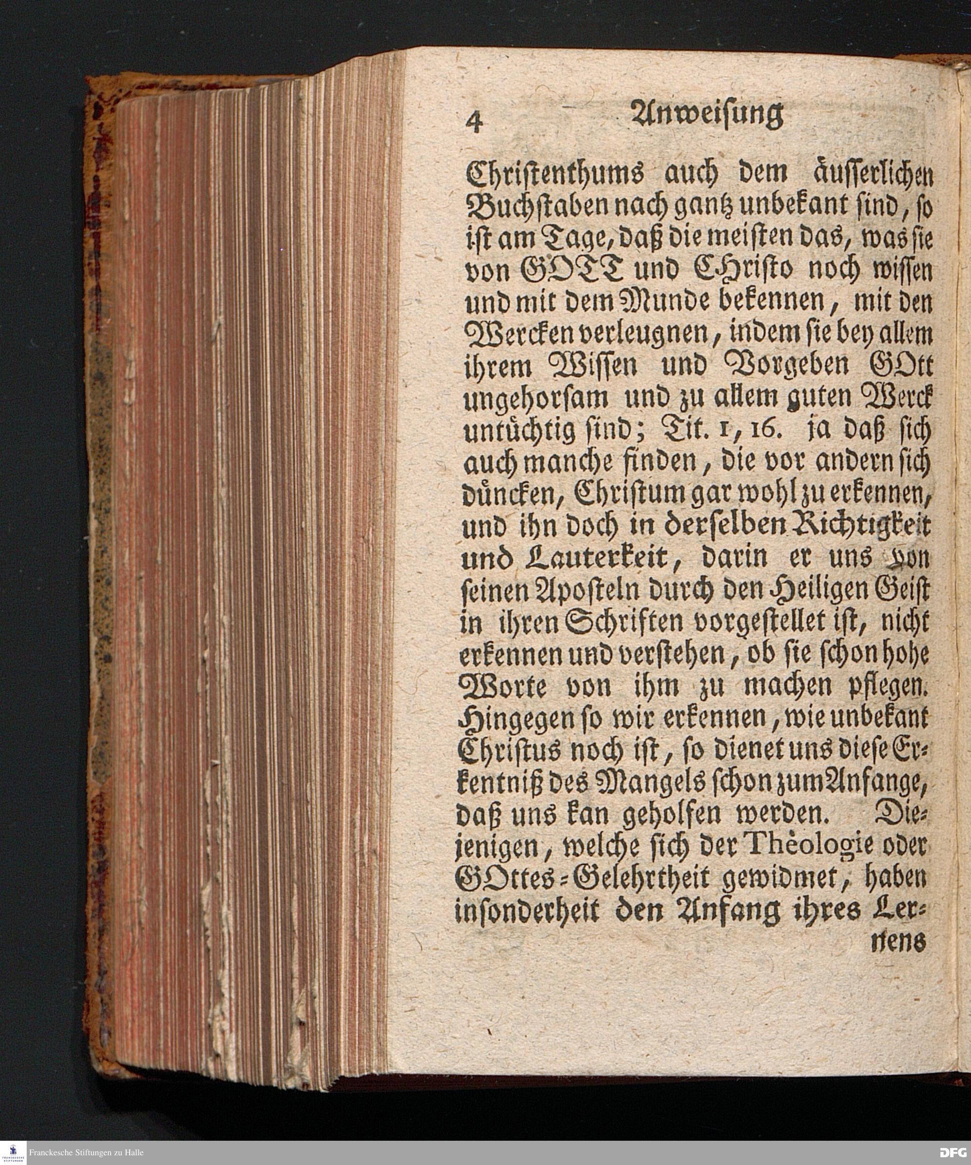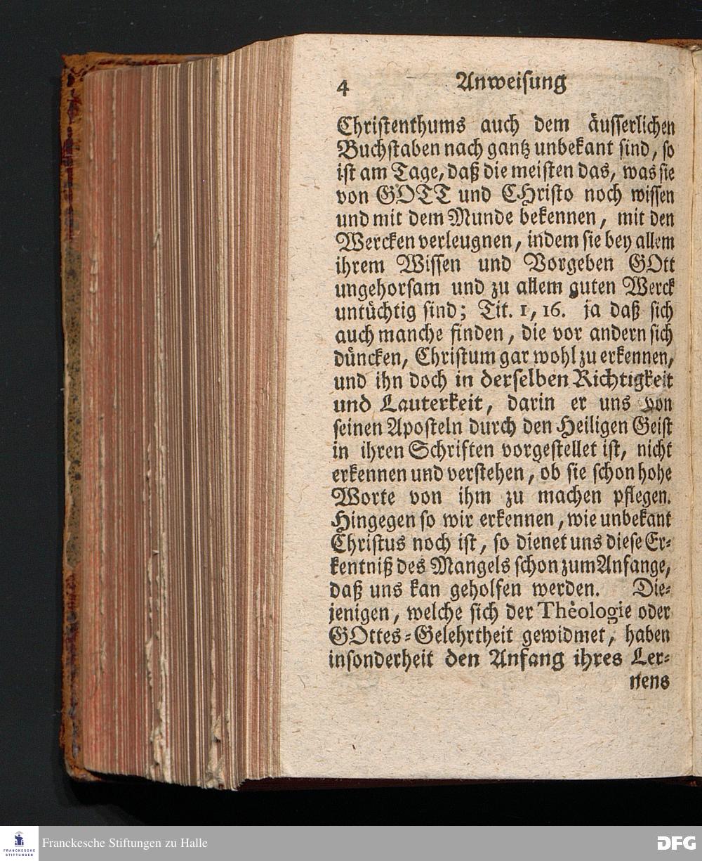 Kurtze Anweisung zur wahren, lauteren und Apostolischen Erkentniß JEsu Christi; Da In zehen Puncten, wie dieselbe nach dem Sinn und der Lehr=Art der Apostel richtig und nachdrücklich zum wahren Heyl der Seelen zu fassen sey, gezeiget wird Von August Hermann Francken, S.Theol.Prof.Ord.& Past.Ulr. Sechste Auflage. HALLE, In Verlegung des Wäysenhauses, 1742.