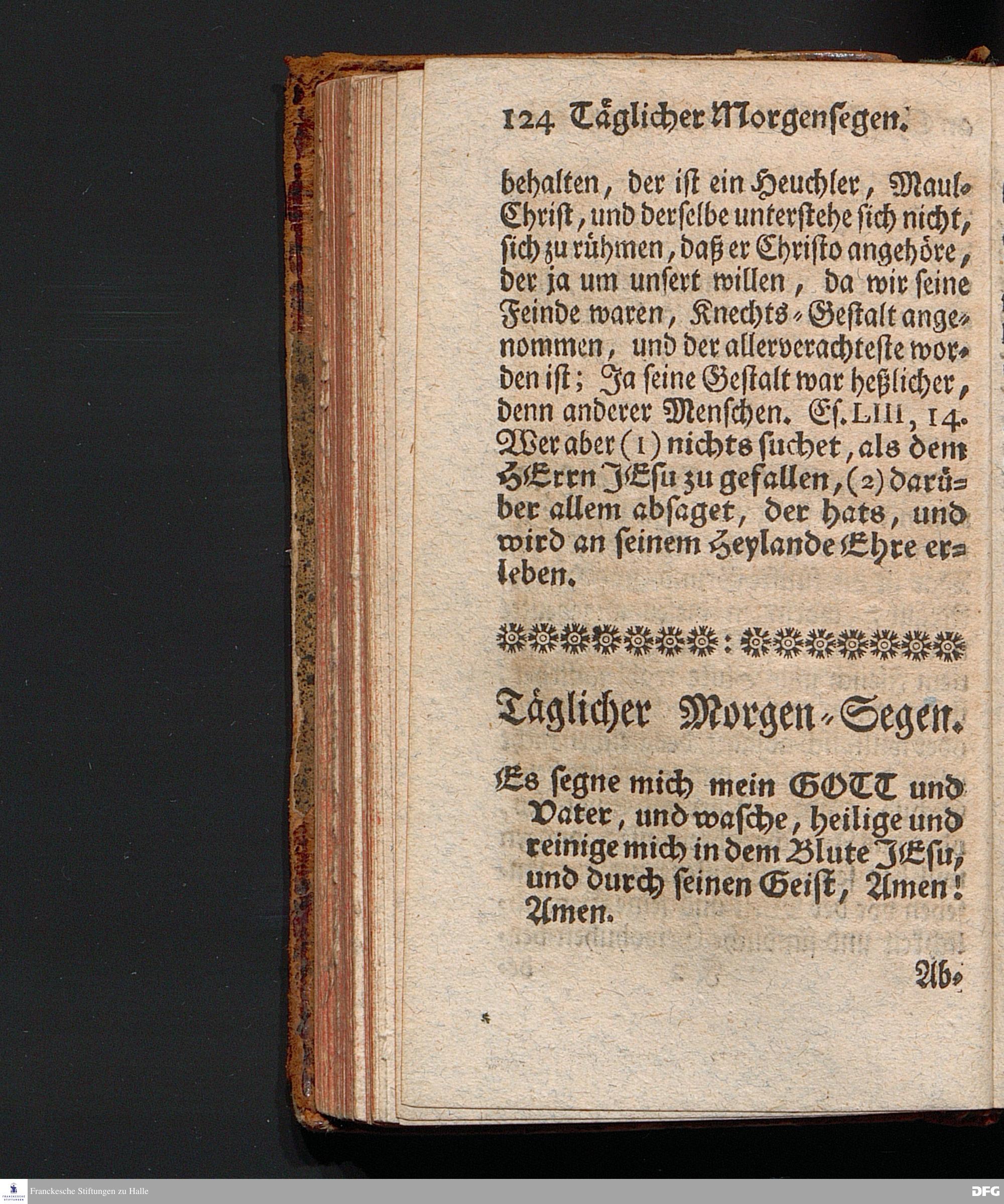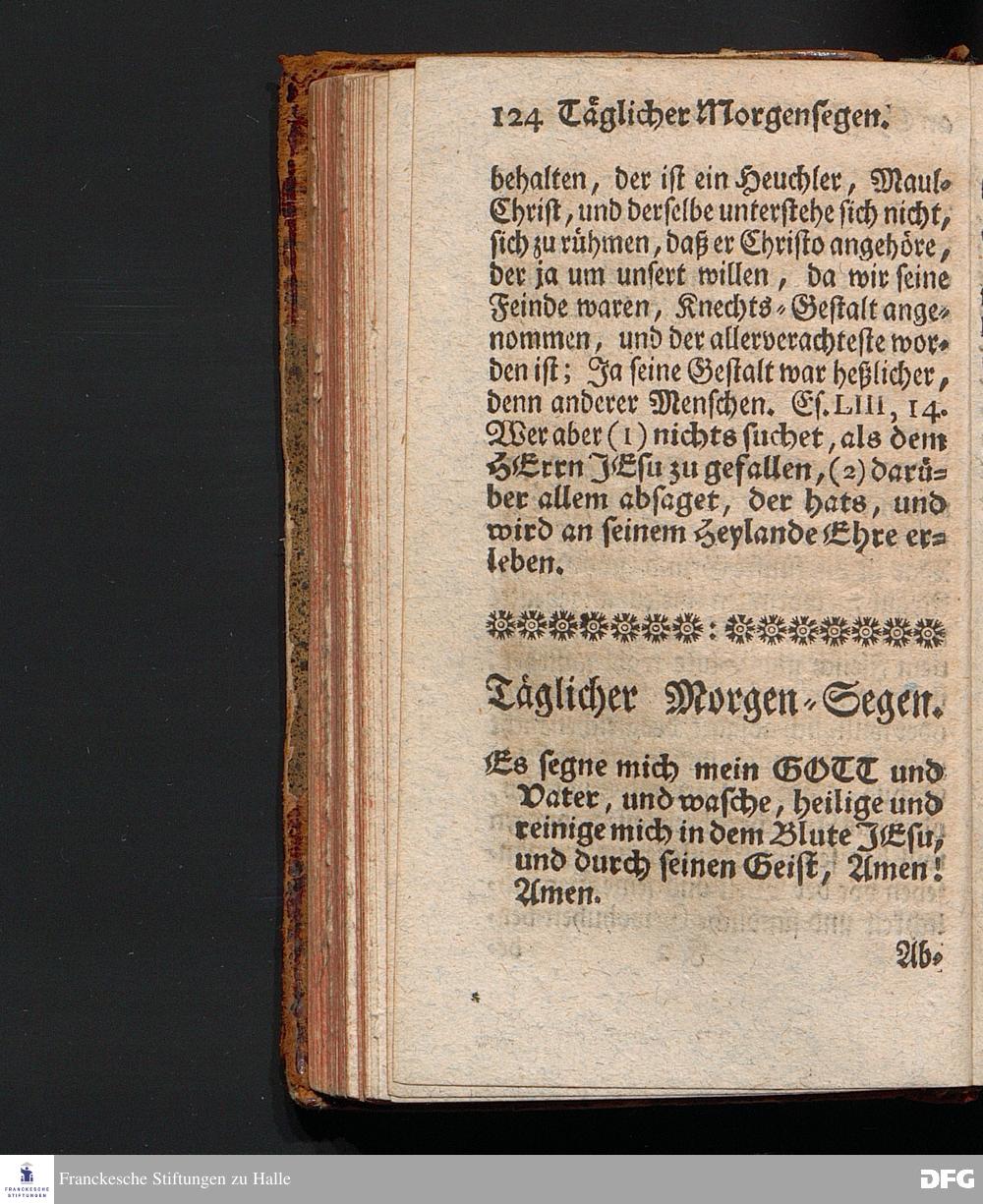 Die Lehre Vom Anfang Christliches Lebens, Bestehend in vier Theilen: I. In einer gründlichen Anleitung zu wahrer Busse und Glauben an GOTT. II. In einem einfältigen Unterricht, wie man die H.Schrift zu seiner wahren Erbauung lesen solle. III. In einer Schriftmäßigen Anweisung, recht und GOTT gefällig zu beten. IV. In einer kurtzen Prüfung, ob man den wahren lebendigen Glauben an CHristum habe oder nicht. Die XVI.Auflage. HALLE, In Verlegung des Wäysenhauses, 1740.