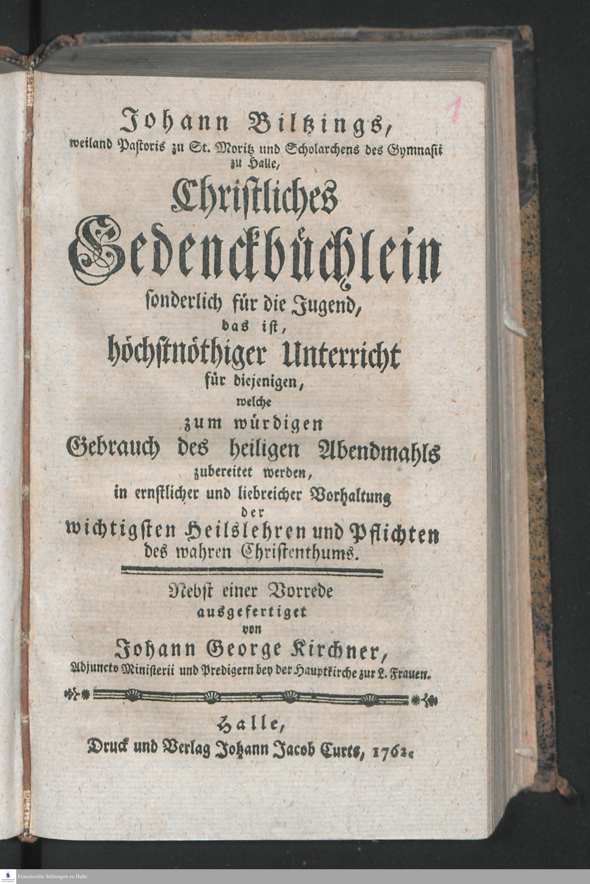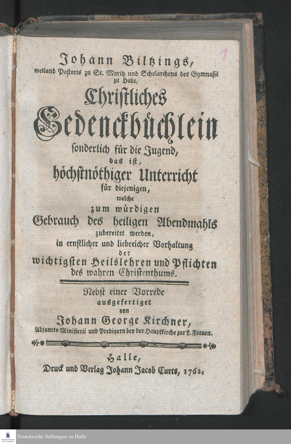 Johann Biltzings, weiland Pastoris zu St. Moritz und Scholarchens des Gymnasii zu Halle, Christliches Gedenckbüchlein sonderlich für die Jugend : das ist höchstnöthiger Unterricht für diejenigen, welche zum würdigen Gebrauch des heiligen Abendmahls zubereitet werden, in ernstlicher und liebreicher Vorhaltung der wichtigsten Heilslehren und Pflichten des wahren Christenthums. Nebst einer Vorrede / ausgefertiget von Johann George Kirchner, Adjuncts Ministerii und Predigern bey der Hauptkirche zur L. Frauen.