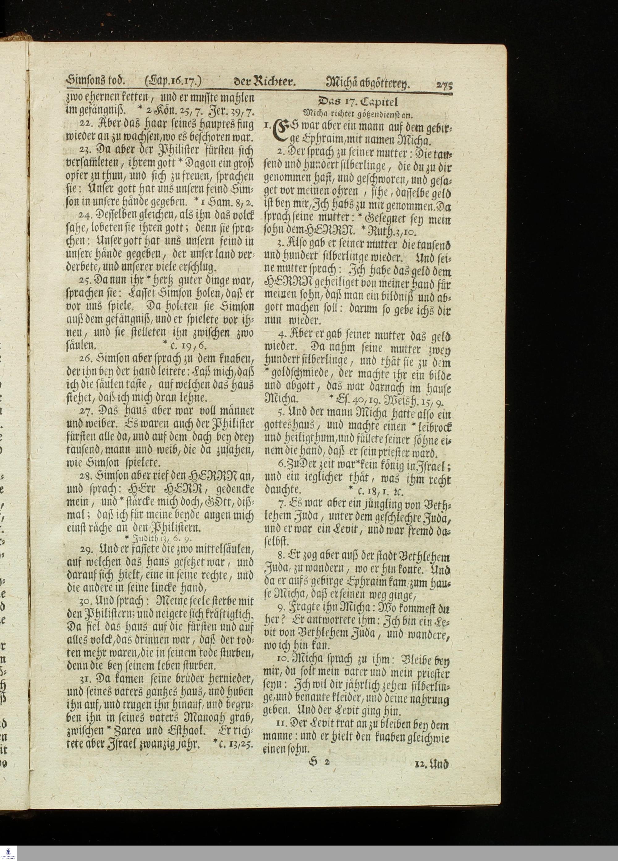 Biblia, Das ist: Die gantze Heil. Schrift Altes und Neues Testaments / Nach der Teutschen Ubersetzung D. Martin Luthers; Mit iedes Capitels kurtzen Summarien, auch beygefügten vielen und richtigen Parallelen; Mit fleiß übersehen/ und gegen einige/ sonderlich erstere/ Editiones des sel. Mannes gehalten, auch an unterschiedlichen Orten nach denselben eingerichtet, und von vielen in den bisherigen Exemplarien hin und wieder eingeschlichenen Fehlern gesaubert. Nebst einer Vorrede Herrn Baron Carl Hildebrands von Canstein.