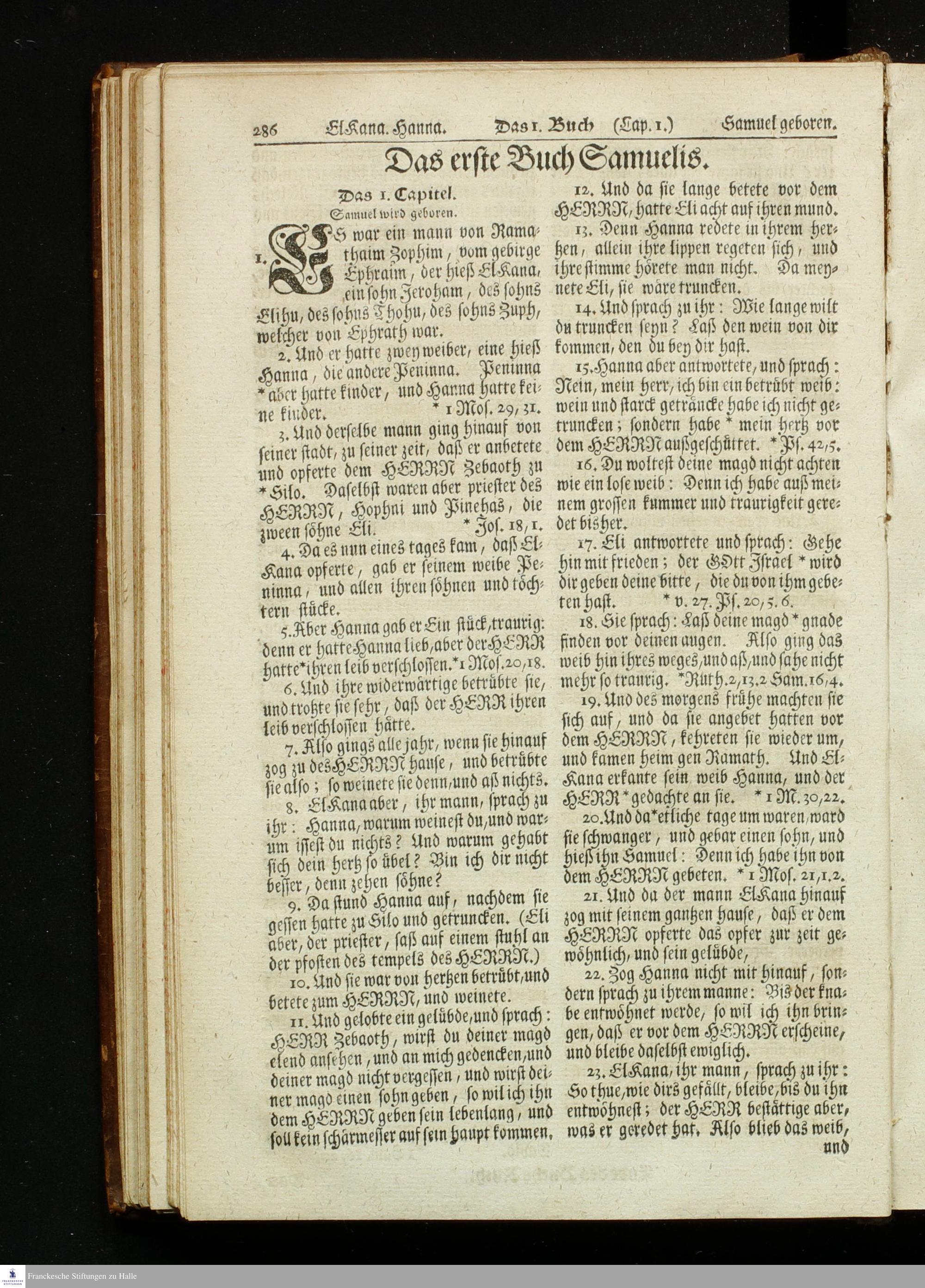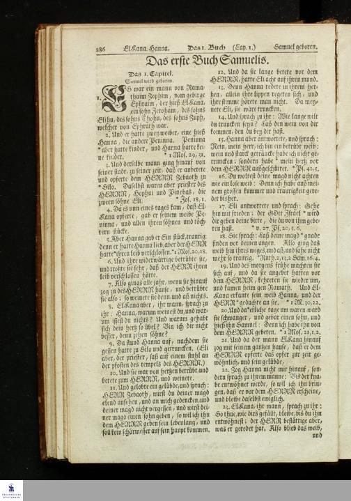 Biblia, Das ist: Die gantze Heil. Schrift Altes und Neues Testaments / Nach der Teutschen Ubersetzung D. Martin Luthers; Mit iedes Capitels kurtzen Summarien, auch beygefügten vielen und richtigen Parallelen; Mit fleiß übersehen/ und gegen einige/ sonderlich erstere/ Editiones des sel. Mannes gehalten, auch an unterschiedlichen Orten nach denselben eingerichtet, und von vielen in den bisherigen Exemplarien hin und wieder eingeschlichenen Fehlern gesaubert. Nebst einer Vorrede Herrn Baron Carl Hildebrands von Canstein.