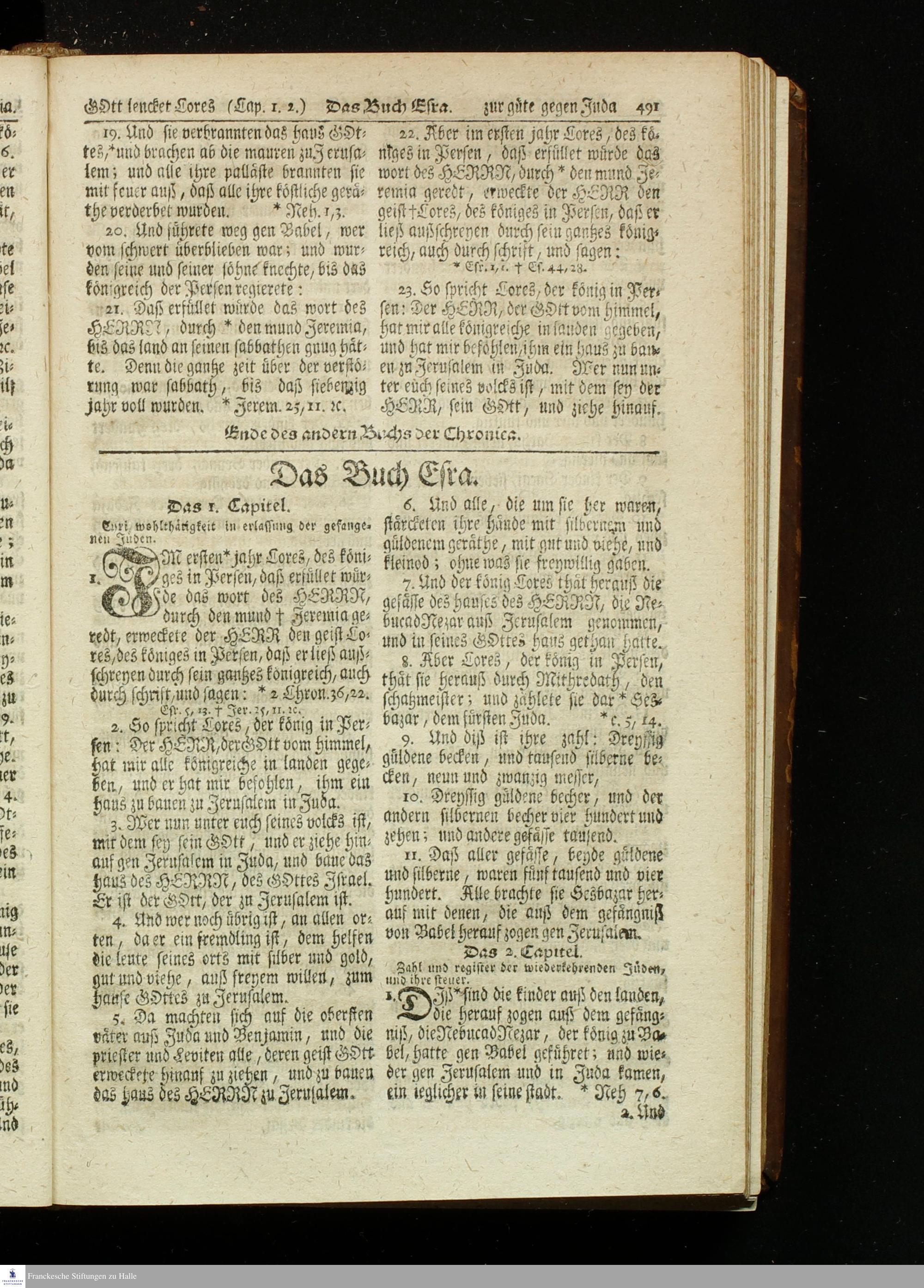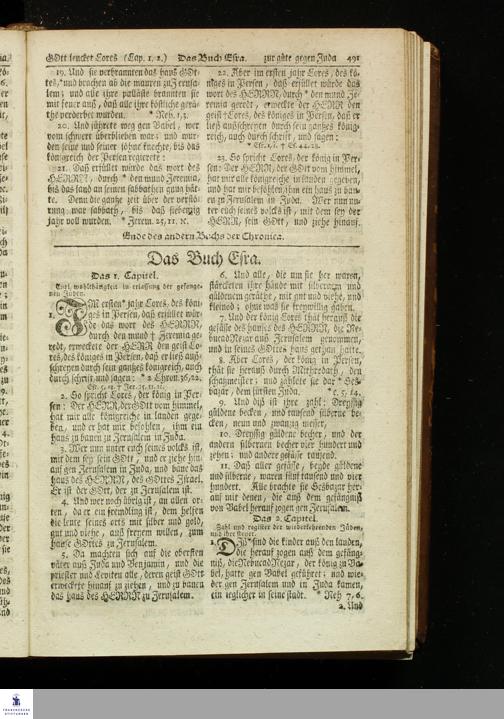 Biblia, Das ist: Die gantze Heil. Schrift Altes und Neues Testaments / Nach der Teutschen Ubersetzung D. Martin Luthers; Mit iedes Capitels kurtzen Summarien, auch beygefügten vielen und richtigen Parallelen; Mit fleiß übersehen/ und gegen einige/ sonderlich erstere/ Editiones des sel. Mannes gehalten, auch an unterschiedlichen Orten nach denselben eingerichtet, und von vielen in den bisherigen Exemplarien hin und wieder eingeschlichenen Fehlern gesaubert. Nebst einer Vorrede Herrn Baron Carl Hildebrands von Canstein.