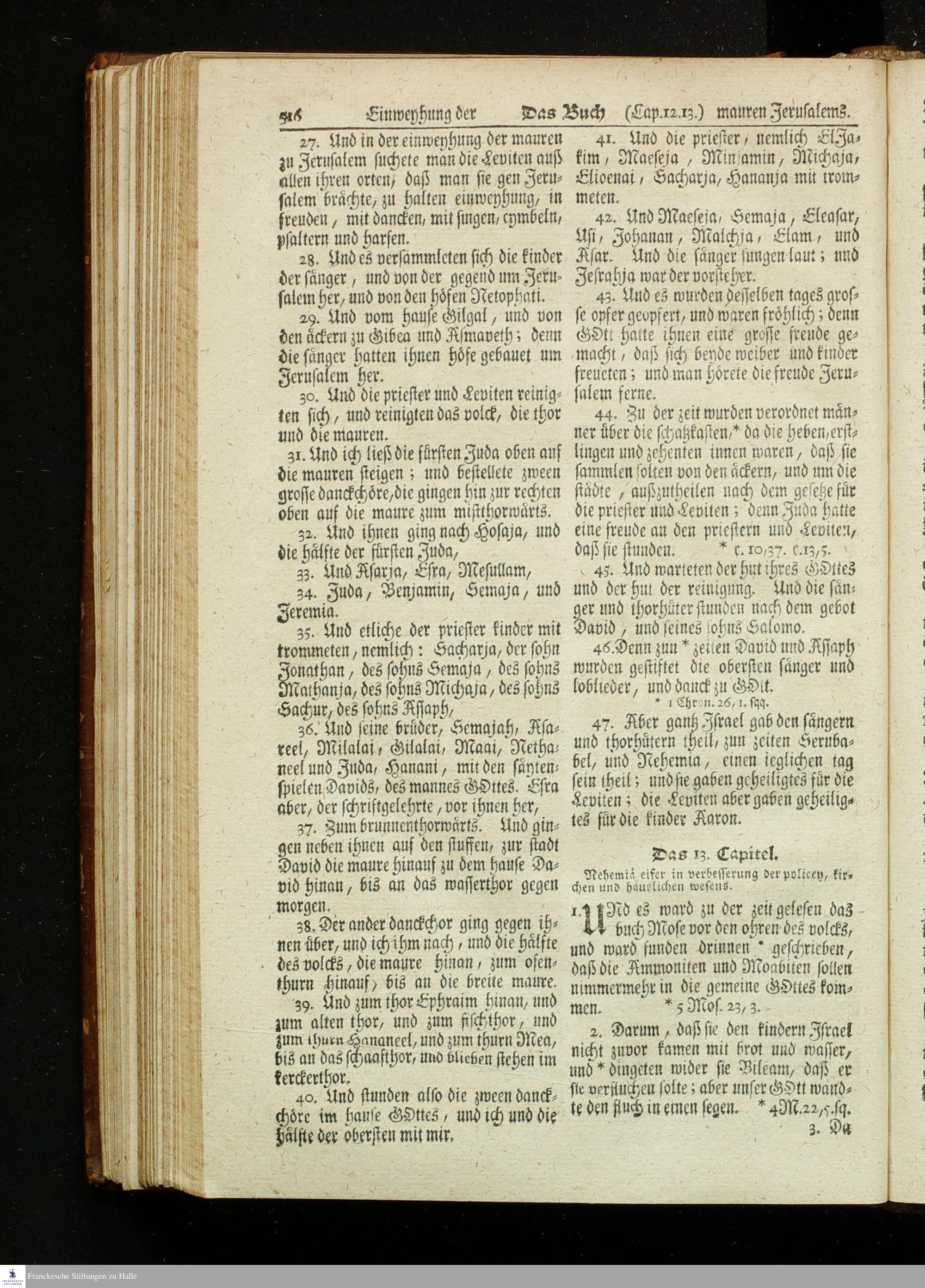 Biblia, Das ist: Die gantze Heil. Schrift Altes und Neues Testaments / Nach der Teutschen Ubersetzung D. Martin Luthers; Mit iedes Capitels kurtzen Summarien, auch beygefügten vielen und richtigen Parallelen; Mit fleiß übersehen/ und gegen einige/ sonderlich erstere/ Editiones des sel. Mannes gehalten, auch an unterschiedlichen Orten nach denselben eingerichtet, und von vielen in den bisherigen Exemplarien hin und wieder eingeschlichenen Fehlern gesaubert. Nebst einer Vorrede Herrn Baron Carl Hildebrands von Canstein.