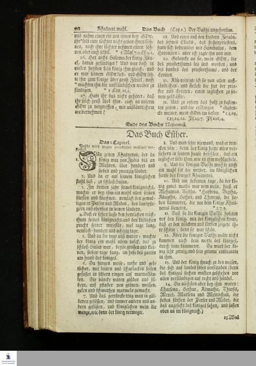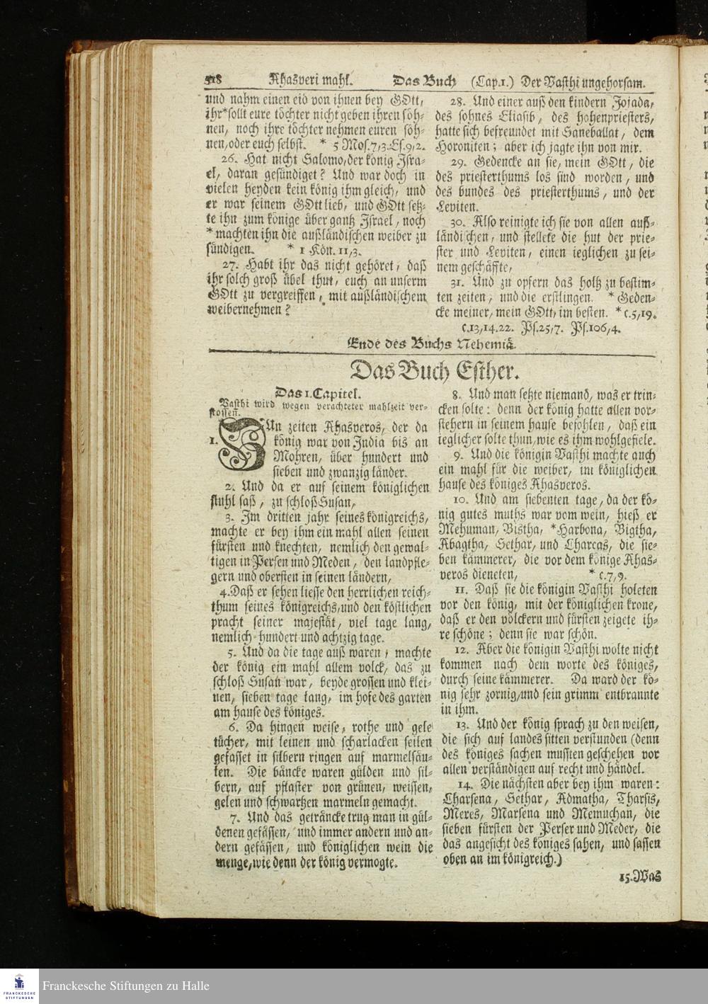 Biblia, Das ist: Die gantze Heil. Schrift Altes und Neues Testaments / Nach der Teutschen Ubersetzung D. Martin Luthers; Mit iedes Capitels kurtzen Summarien, auch beygefügten vielen und richtigen Parallelen; Mit fleiß übersehen/ und gegen einige/ sonderlich erstere/ Editiones des sel. Mannes gehalten, auch an unterschiedlichen Orten nach denselben eingerichtet, und von vielen in den bisherigen Exemplarien hin und wieder eingeschlichenen Fehlern gesaubert. Nebst einer Vorrede Herrn Baron Carl Hildebrands von Canstein.