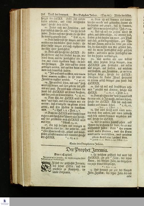 Biblia, Das ist: Die gantze Heil. Schrift Altes und Neues Testaments / Nach der Teutschen Ubersetzung D. Martin Luthers; Mit iedes Capitels kurtzen Summarien, auch beygefügten vielen und richtigen Parallelen; Mit fleiß übersehen/ und gegen einige/ sonderlich erstere/ Editiones des sel. Mannes gehalten, auch an unterschiedlichen Orten nach denselben eingerichtet, und von vielen in den bisherigen Exemplarien hin und wieder eingeschlichenen Fehlern gesaubert. Nebst einer Vorrede Herrn Baron Carl Hildebrands von Canstein.