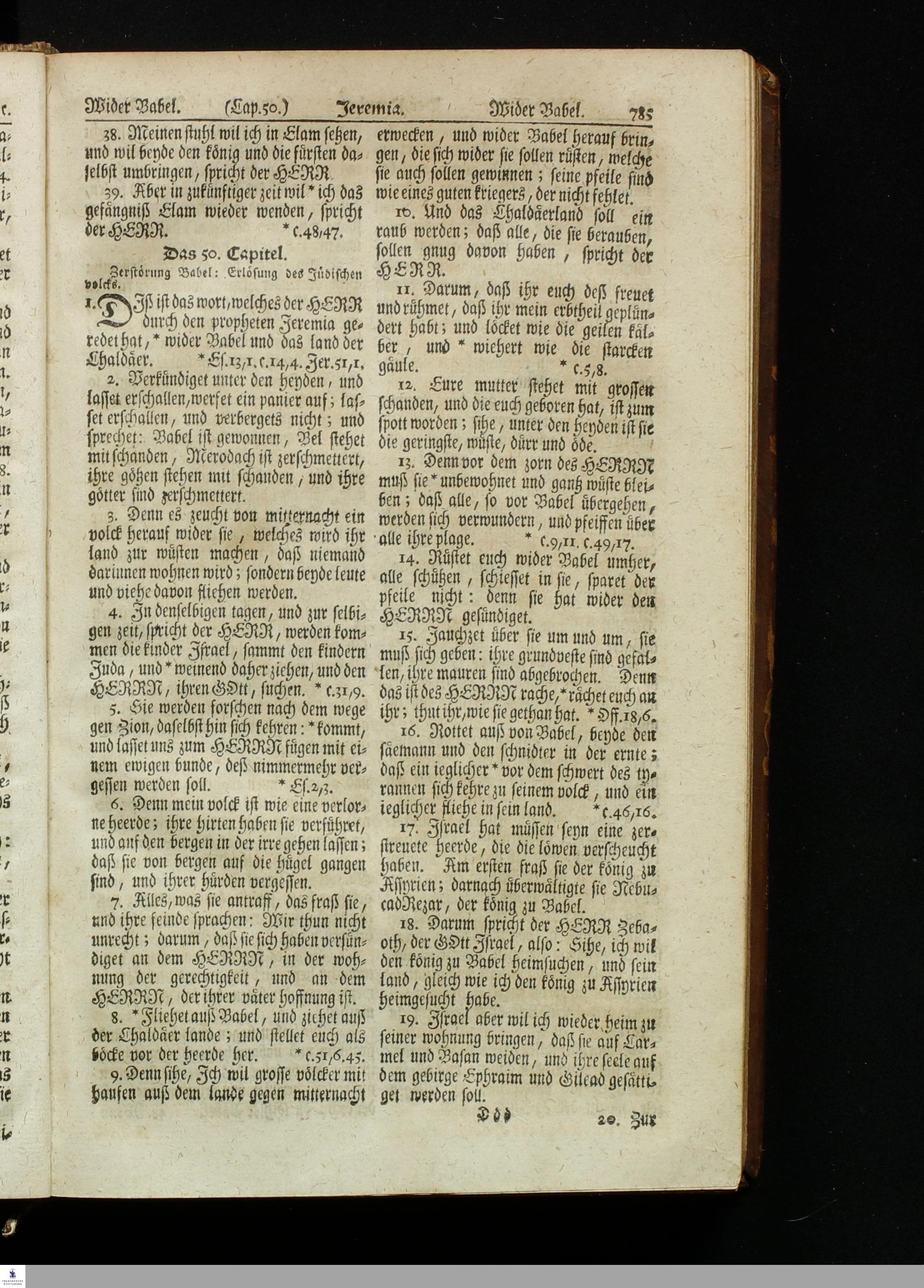 Biblia, Das ist: Die gantze Heil. Schrift Altes und Neues Testaments / Nach der Teutschen Ubersetzung D. Martin Luthers; Mit iedes Capitels kurtzen Summarien, auch beygefügten vielen und richtigen Parallelen; Mit fleiß übersehen/ und gegen einige/ sonderlich erstere/ Editiones des sel. Mannes gehalten, auch an unterschiedlichen Orten nach denselben eingerichtet, und von vielen in den bisherigen Exemplarien hin und wieder eingeschlichenen Fehlern gesaubert. Nebst einer Vorrede Herrn Baron Carl Hildebrands von Canstein.