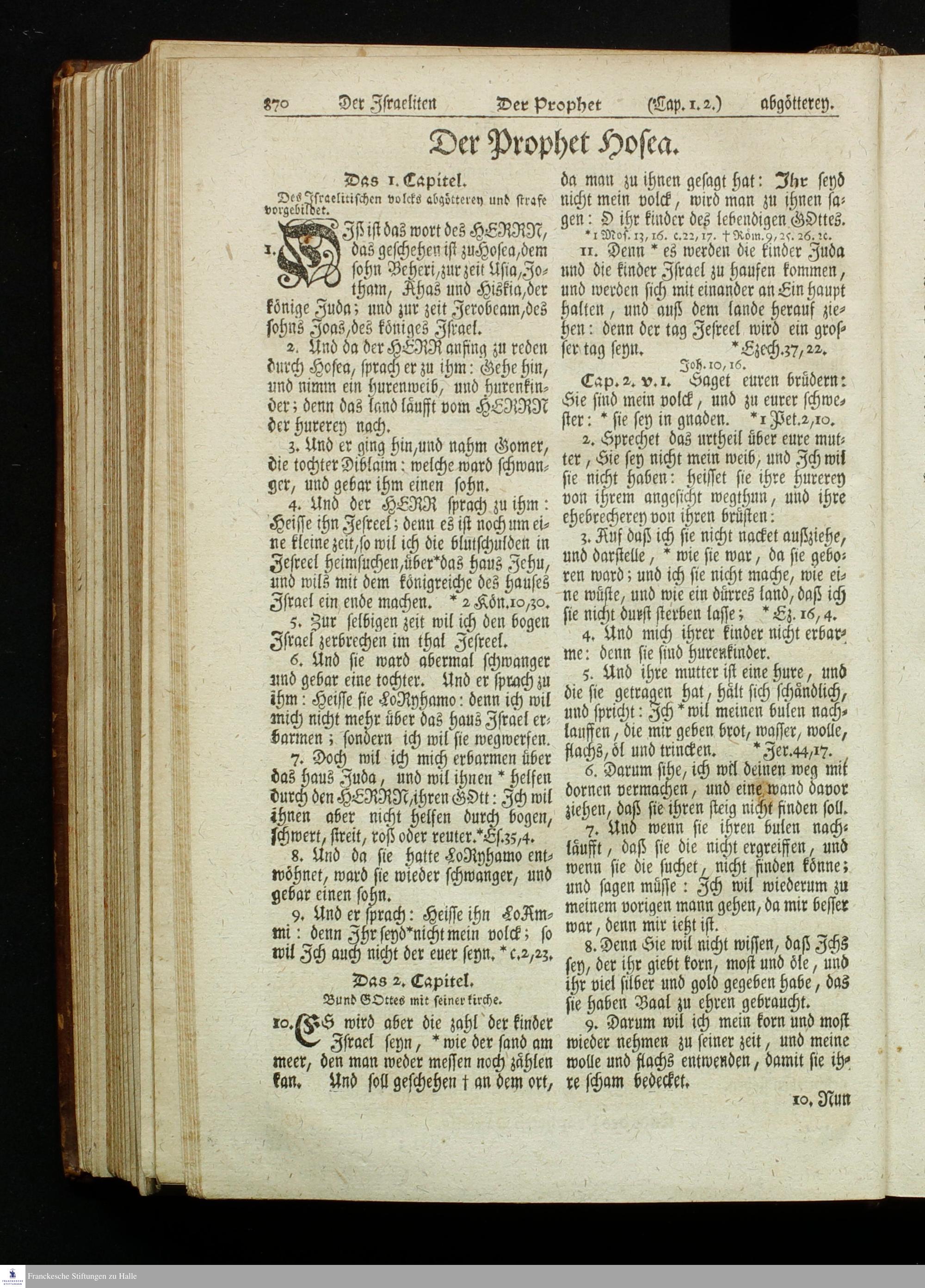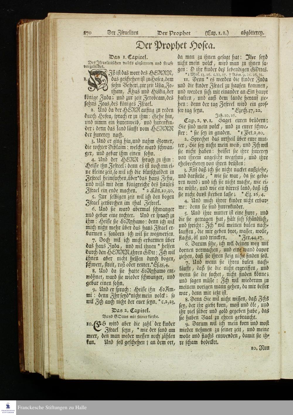 Biblia, Das ist: Die gantze Heil. Schrift Altes und Neues Testaments / Nach der Teutschen Ubersetzung D. Martin Luthers; Mit iedes Capitels kurtzen Summarien, auch beygefügten vielen und richtigen Parallelen; Mit fleiß übersehen/ und gegen einige/ sonderlich erstere/ Editiones des sel. Mannes gehalten, auch an unterschiedlichen Orten nach denselben eingerichtet, und von vielen in den bisherigen Exemplarien hin und wieder eingeschlichenen Fehlern gesaubert. Nebst einer Vorrede Herrn Baron Carl Hildebrands von Canstein.