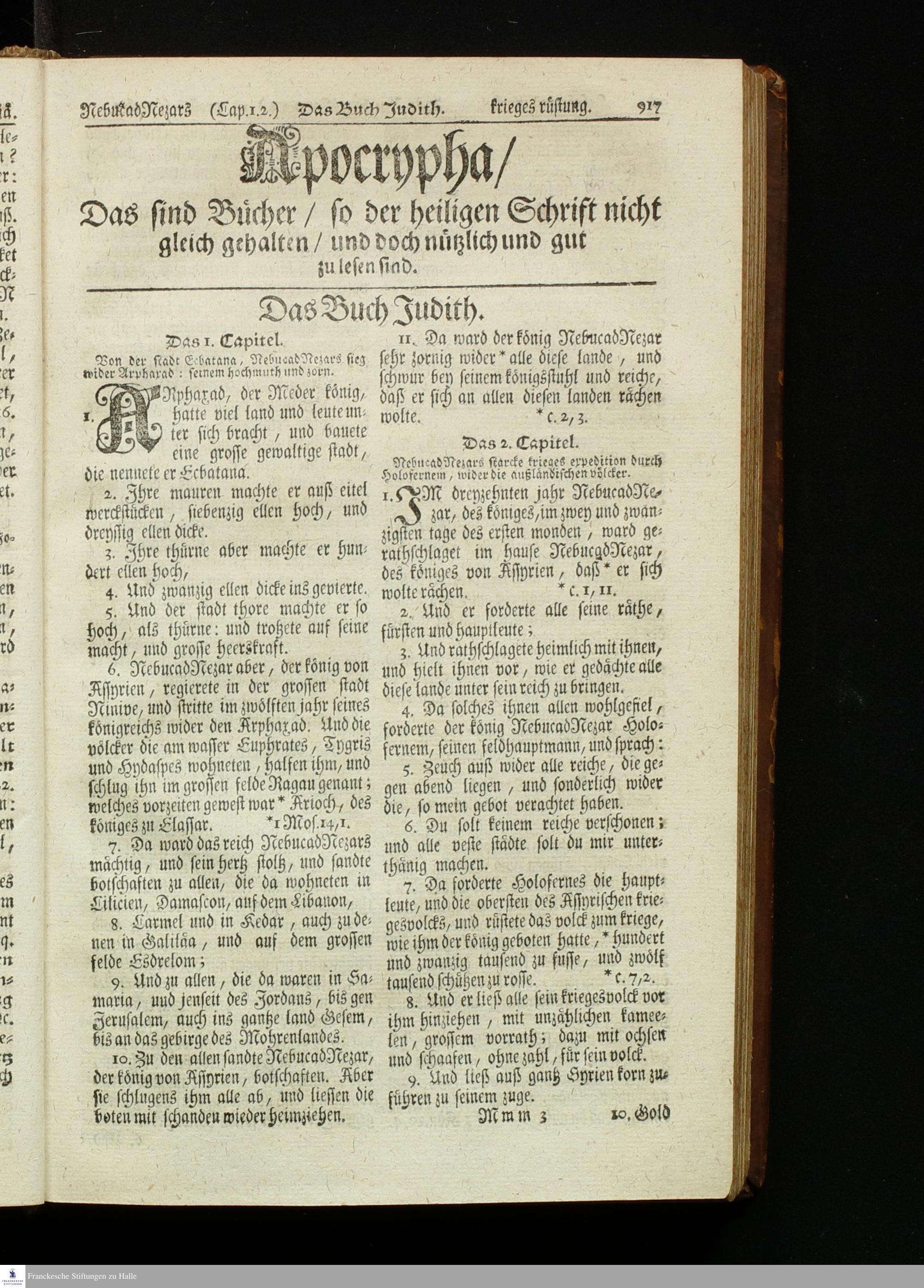 Biblia, Das ist: Die gantze Heil. Schrift Altes und Neues Testaments / Nach der Teutschen Ubersetzung D. Martin Luthers; Mit iedes Capitels kurtzen Summarien, auch beygefügten vielen und richtigen Parallelen; Mit fleiß übersehen/ und gegen einige/ sonderlich erstere/ Editiones des sel. Mannes gehalten, auch an unterschiedlichen Orten nach denselben eingerichtet, und von vielen in den bisherigen Exemplarien hin und wieder eingeschlichenen Fehlern gesaubert. Nebst einer Vorrede Herrn Baron Carl Hildebrands von Canstein.