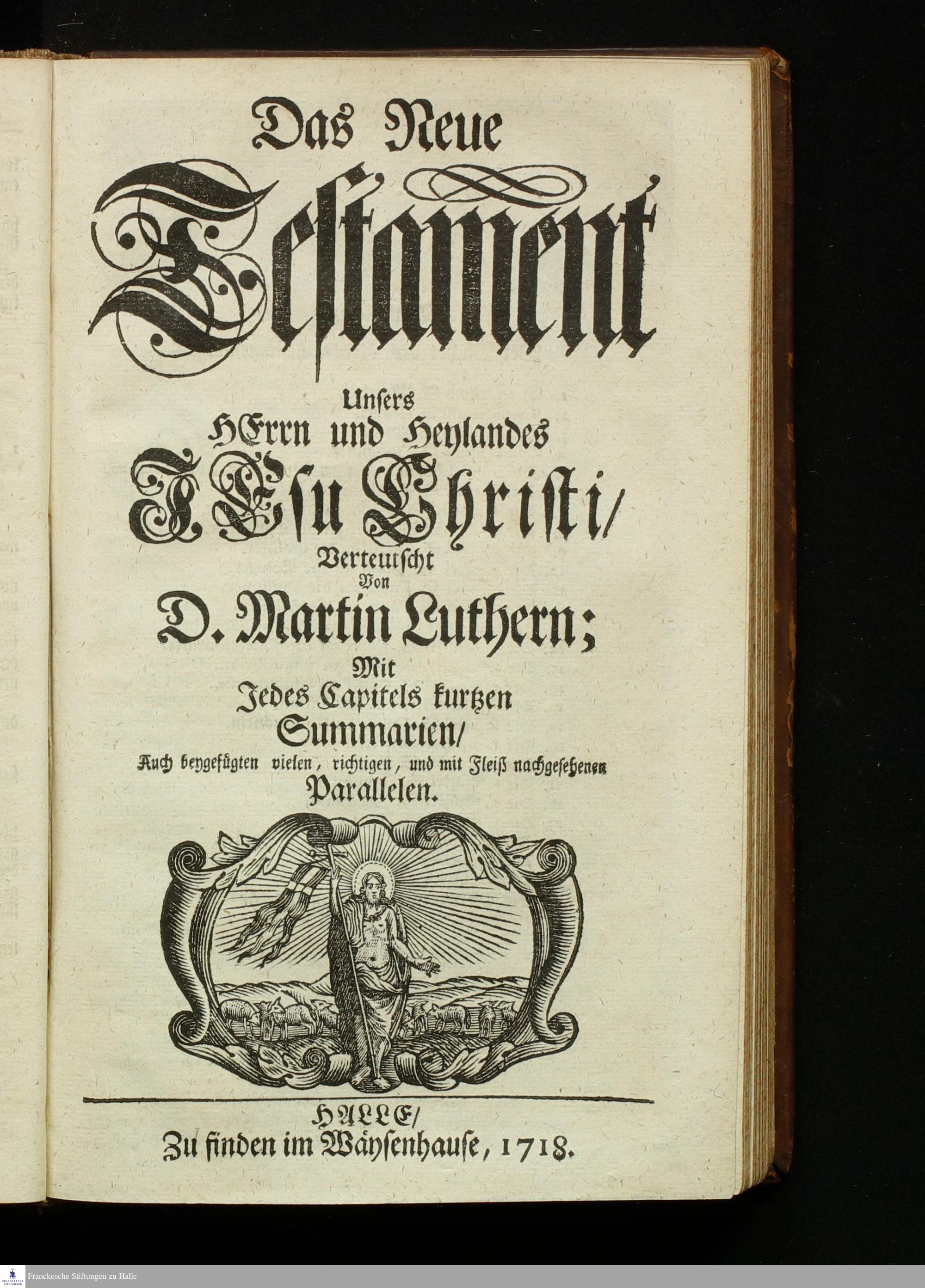 Biblia, Das ist: Die gantze Heil. Schrift Altes und Neues Testaments / Nach der Teutschen Ubersetzung D. Martin Luthers; Mit iedes Capitels kurtzen Summarien, auch beygefügten vielen und richtigen Parallelen; Mit fleiß übersehen/ und gegen einige/ sonderlich erstere/ Editiones des sel. Mannes gehalten, auch an unterschiedlichen Orten nach denselben eingerichtet, und von vielen in den bisherigen Exemplarien hin und wieder eingeschlichenen Fehlern gesaubert. Nebst einer Vorrede Herrn Baron Carl Hildebrands von Canstein.